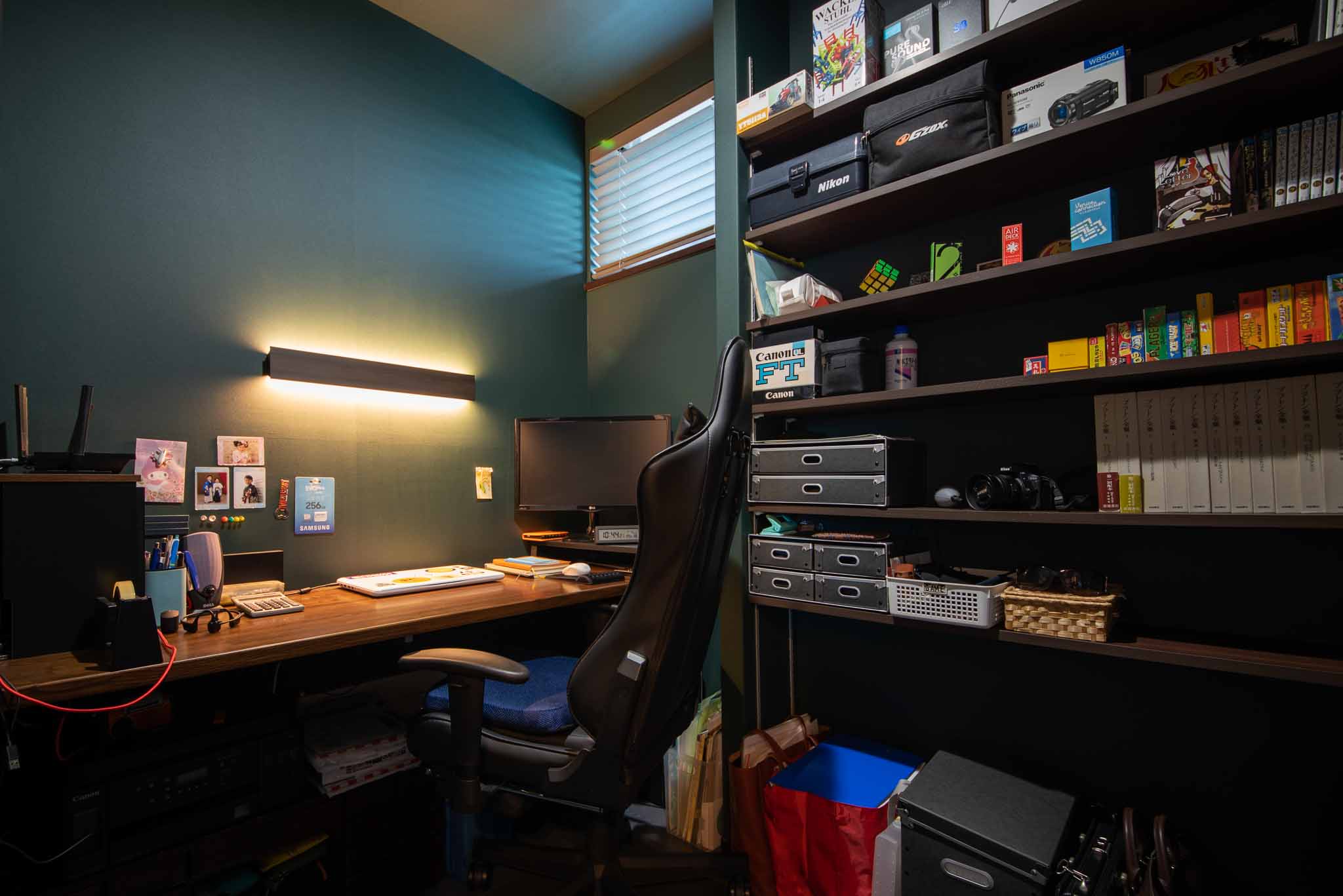 書斎:2階中央部に設けられた書斎は、深いグリーンのクロスで落ち着きを重視したデザイン。Nさまがパソコン作業を快適に行えるスペースです。