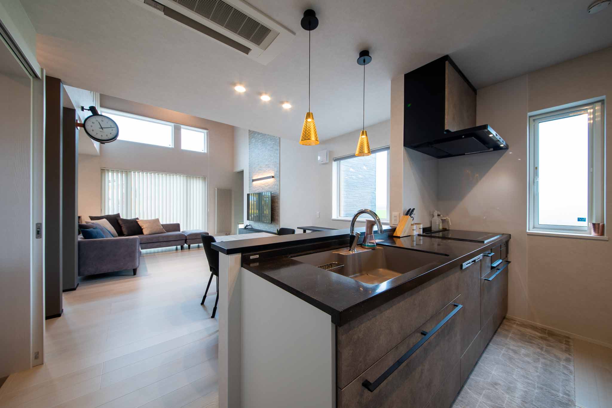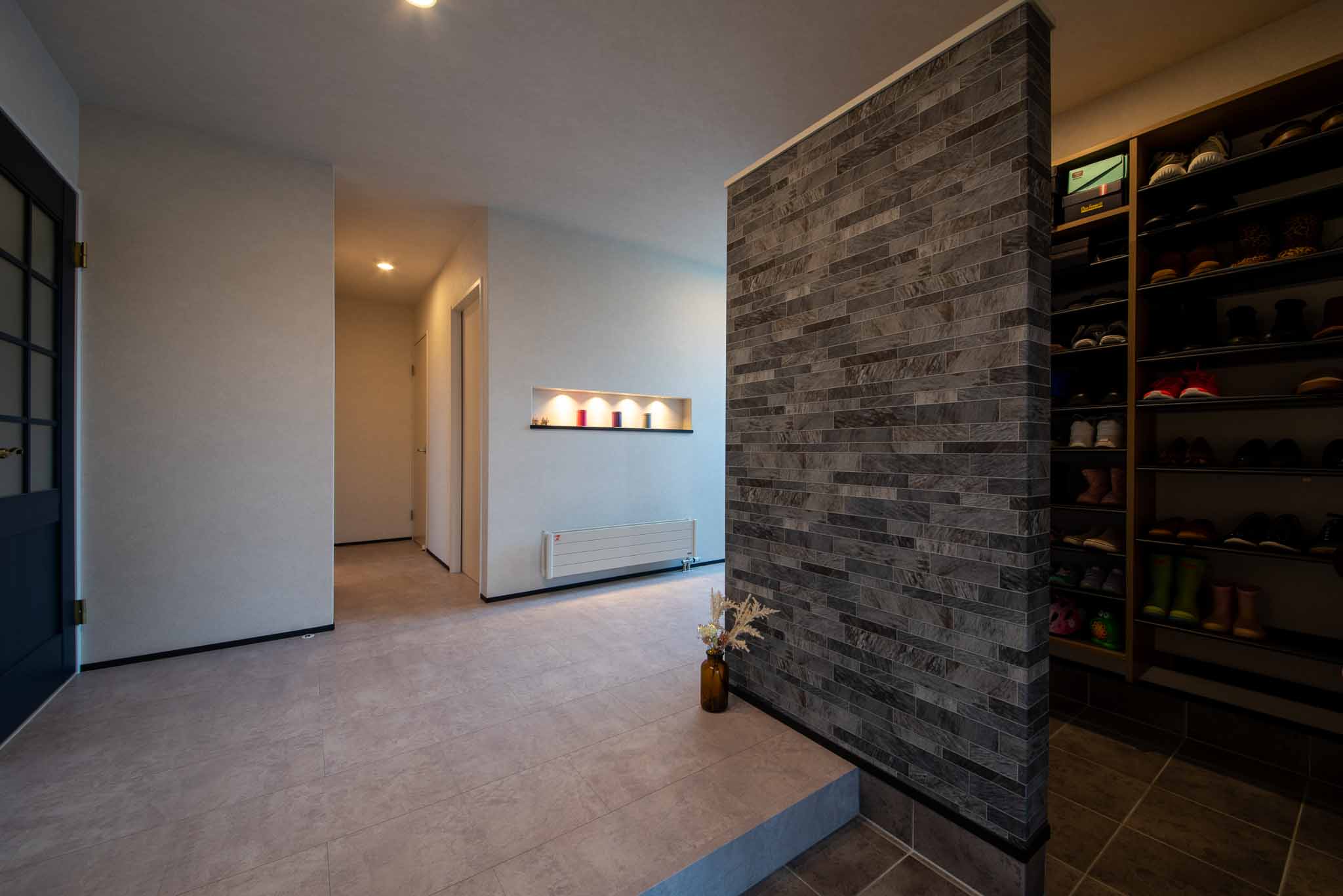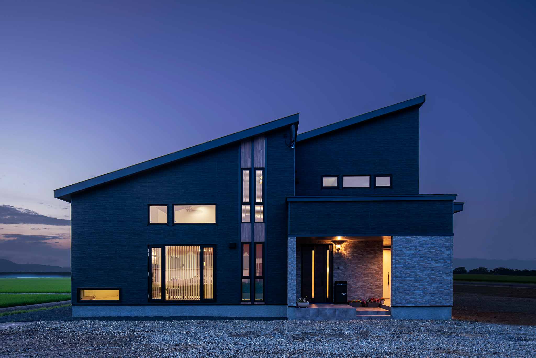 外観:斜めのラインとシャープな窓枠が印象的なモダンな外観。落雪屋根が冬の厳しい気候にも対応し、親子ドアのメイン玄関がグレード感を演出します。玄関ポーチから続くもう一つの玄関は農作業用の便利な出入り口となっています。