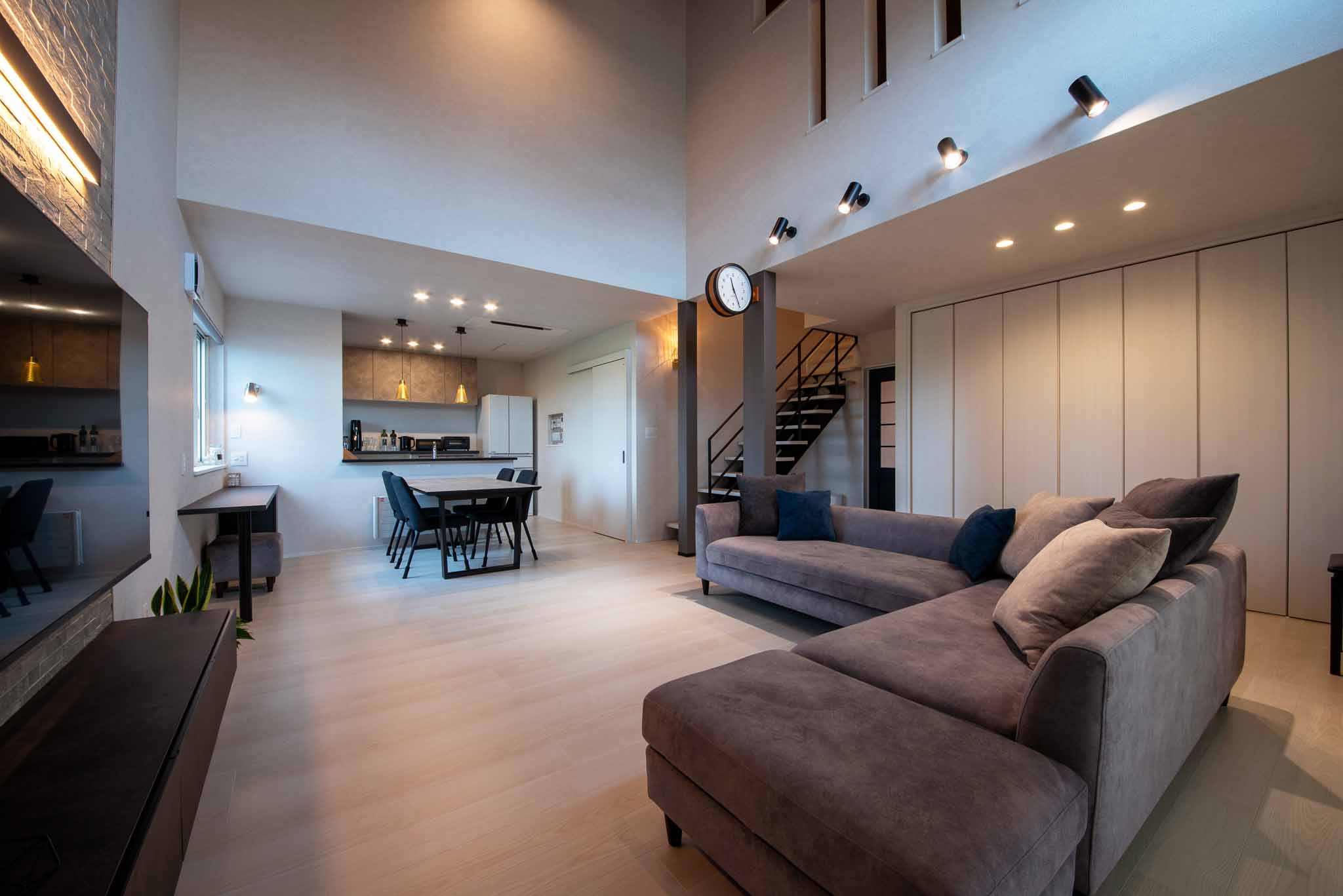 LDK:広々としたLDKは約26帖あり、10帖分の吹き抜けが空間の広がりを生み出しています。自然光がたっぷりと差し込む明るいリビングは、家族が集まりリラックスできる場所です。キッチンは機能性とデザイン性を兼ね備えており、家事が楽しくなる空間です。リビングのTV設置壁の裏側には隠れ家のような和室があり、家族の憩いの場として利用できます。