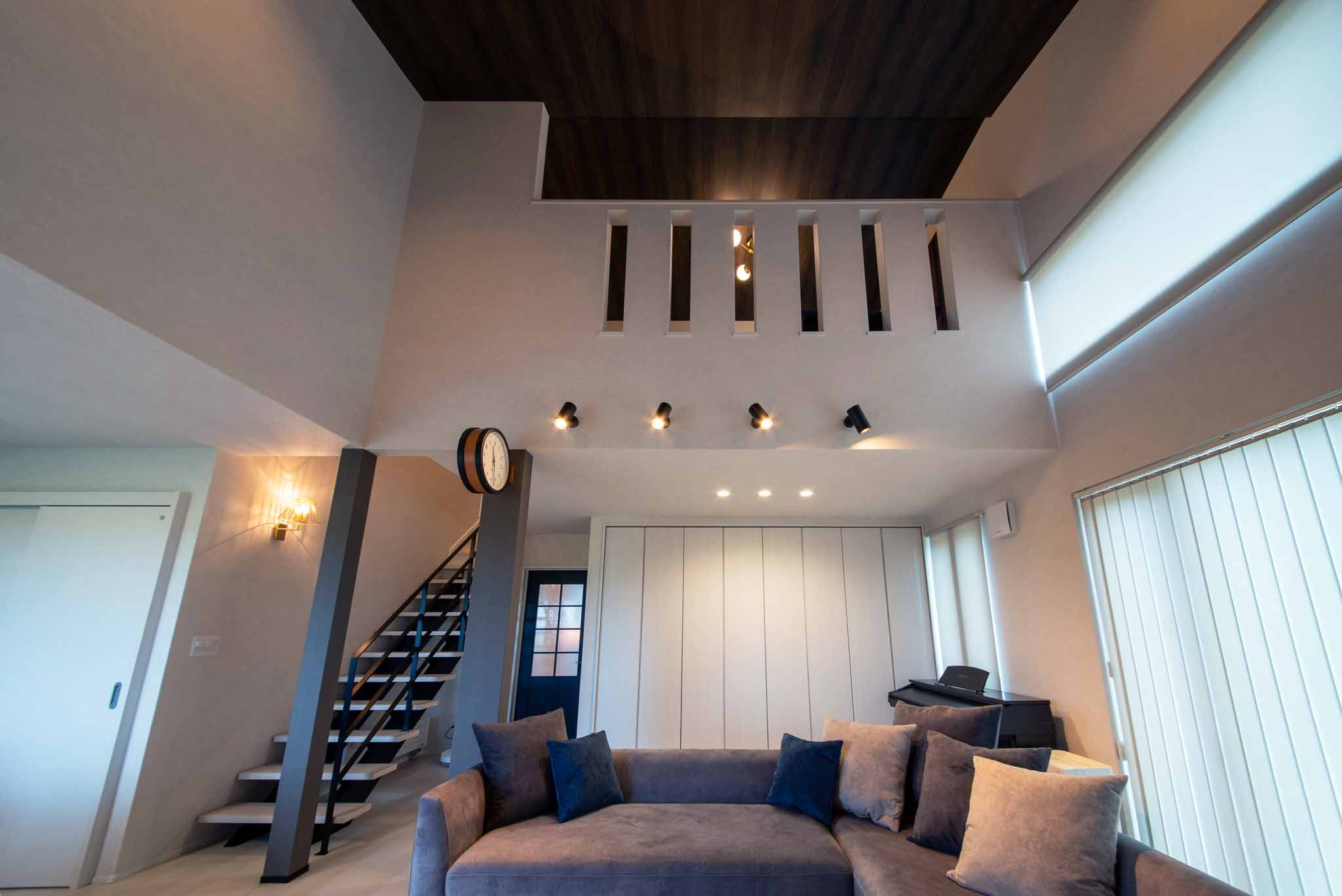 LDK・セカンドリビング:リビングにせり出す形で設けられたセカンドリビングは、1階と2階をつなぐ吹き抜けの空間で一体感を生み出します。スリットの入った腰壁により、どちらの階にいても互いの様子を確認できます。