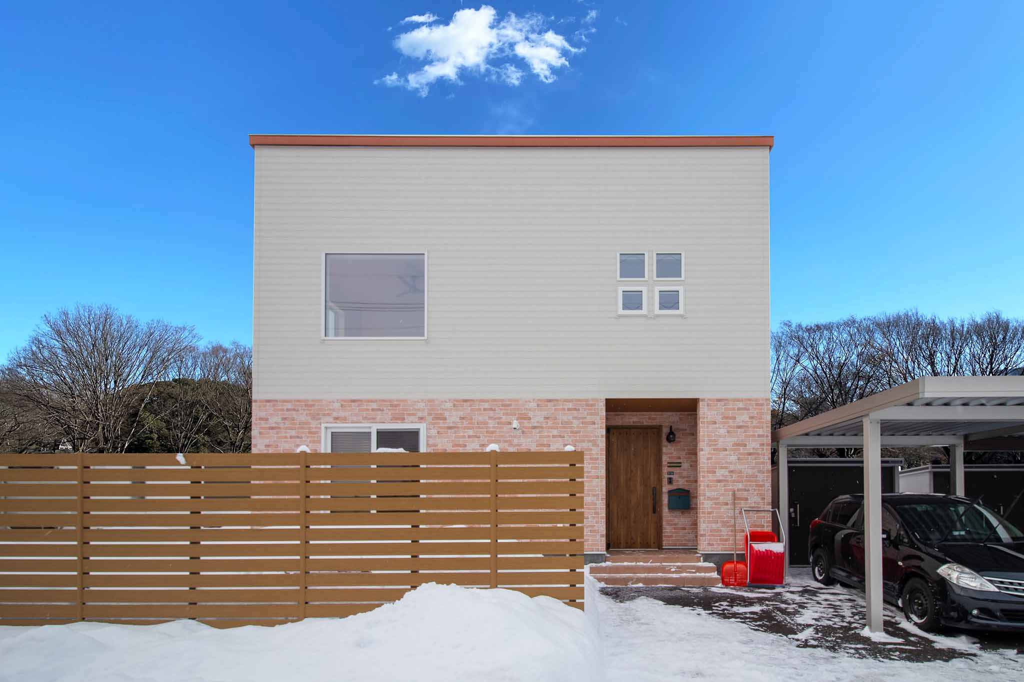 外観:外観は、上部に木目調ホワイト、下部にアンティークレンガ調オレンジの窯業系サイディングを張り分けています。光触媒効果で汚れを分解する外壁材を採用しており、メンテナンスが容易です。