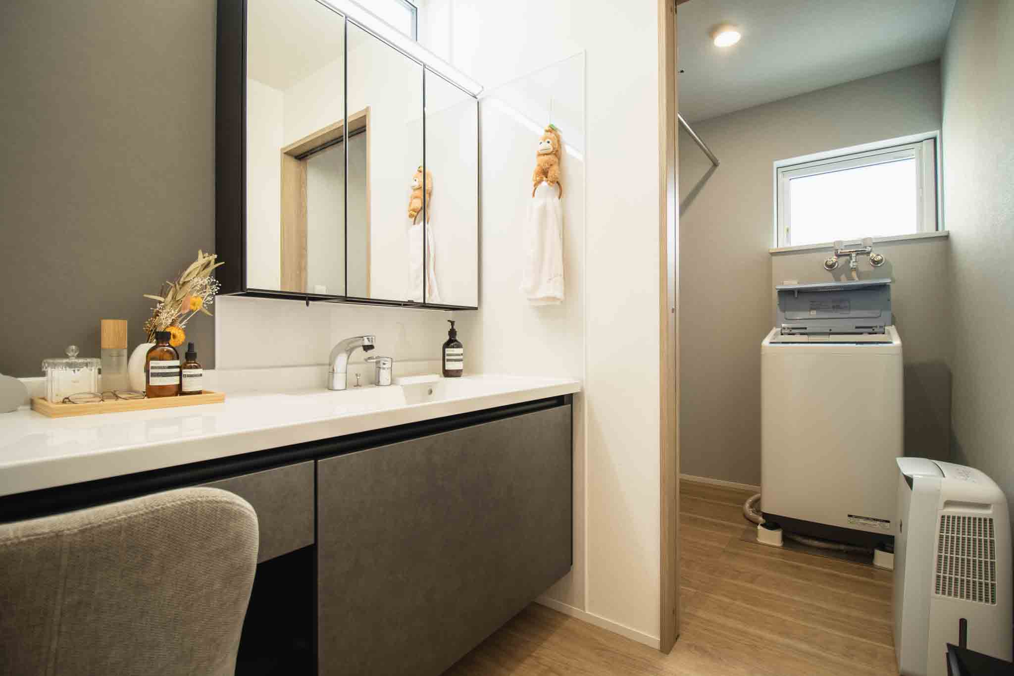 洗面室:タッチレスのライン照明が設置された洗面室は、ホテルライクなデザインで、朝の目覚めを心地よくしてくれます。広々としたカウンターは、メイクスペースや複数人での利用にも対応可能です。デザインと機能性を兼ね備えた空間です。