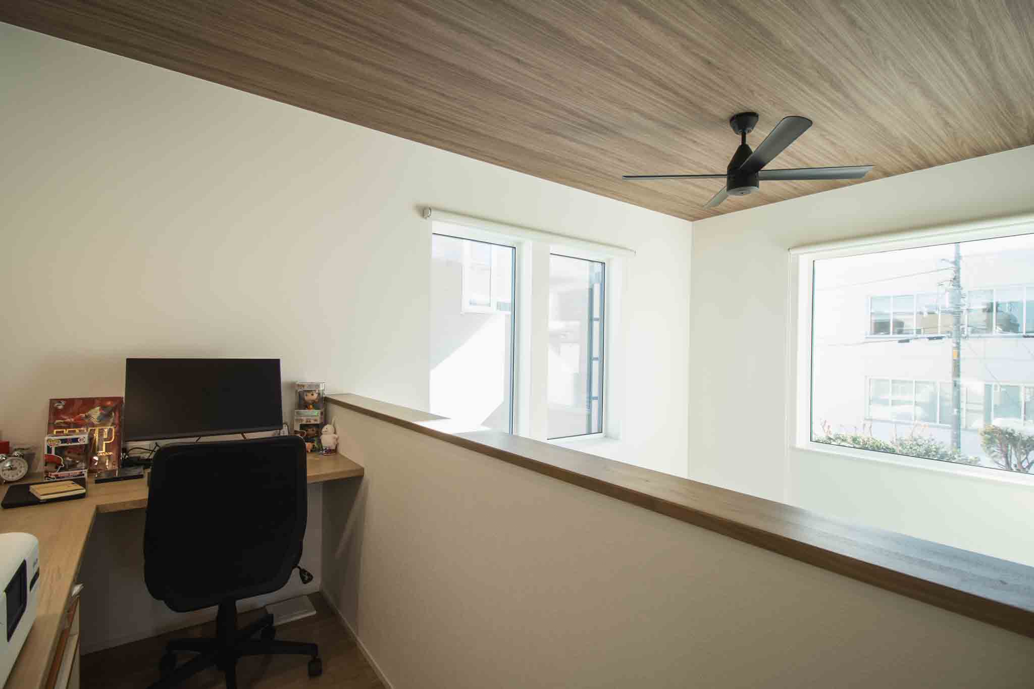 2Fホール:2階のホールにはデスクスペースが設けられており、作業や勉強をするのに最適です。吹き抜けに面しているため、1階にいる家族とのコミュニケーションも取りやすく、程よい距離感を保てます。