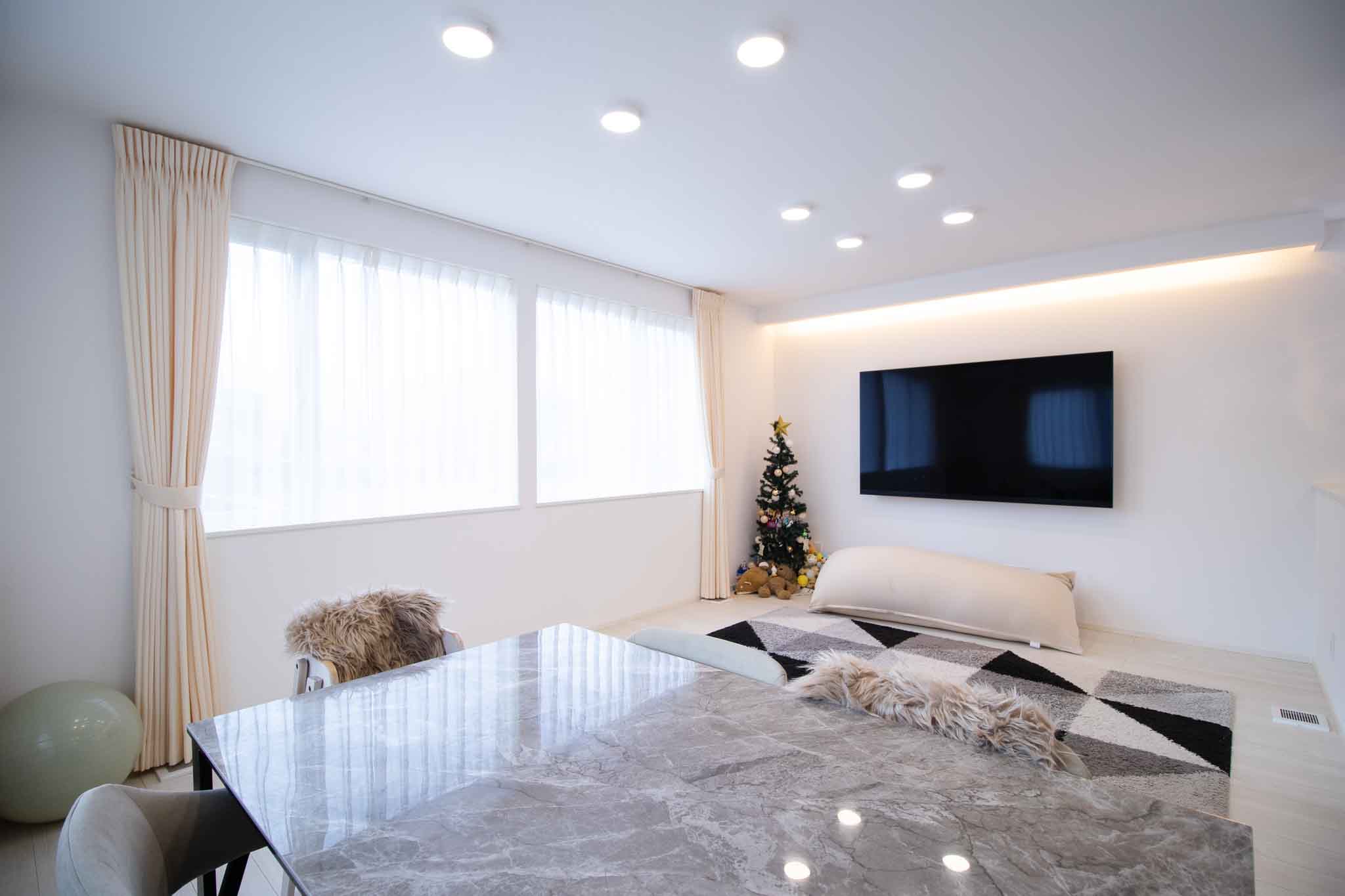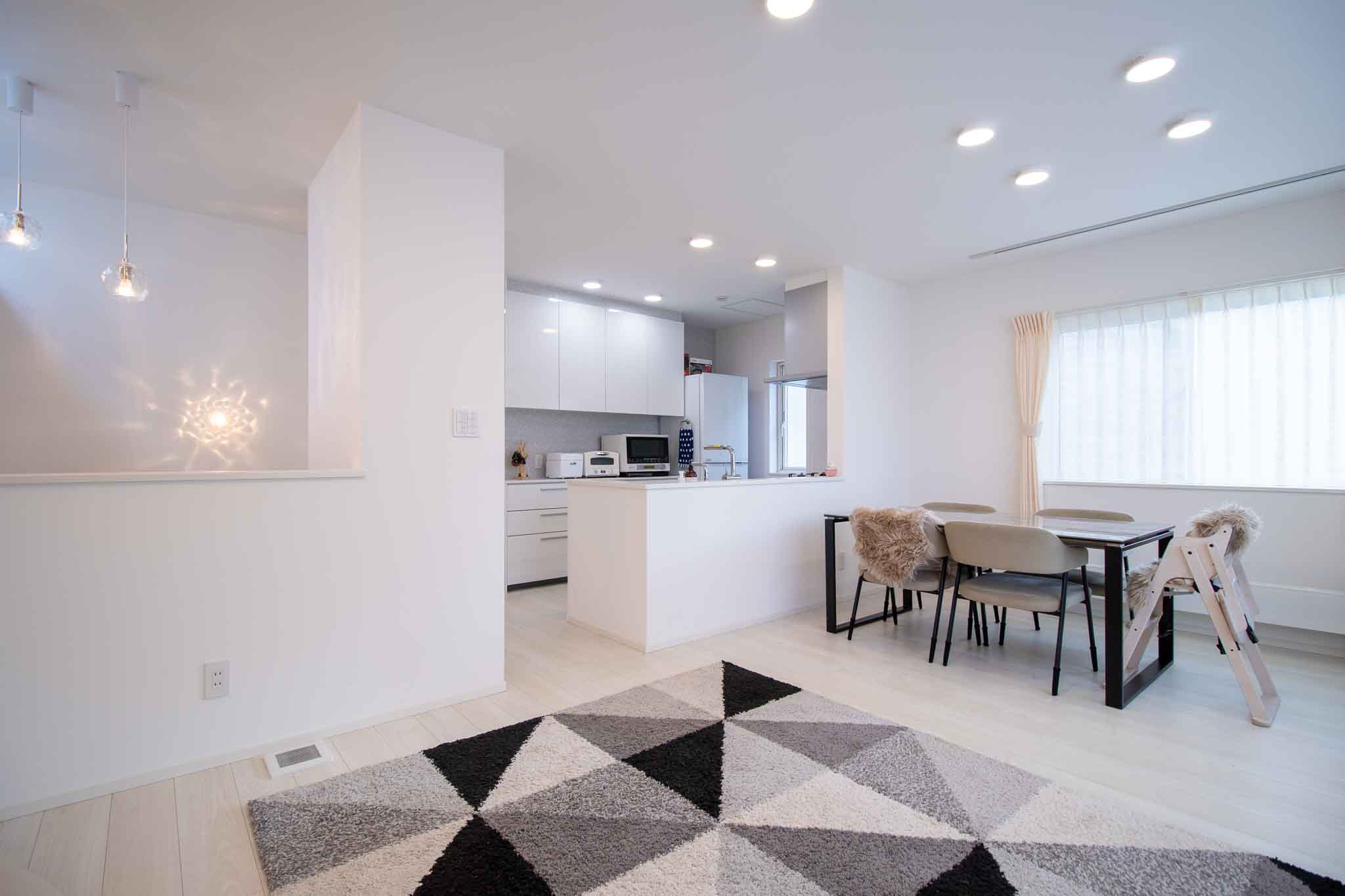 LDK:2階に位置する18帖のLDKは、キッチンとリビング・ダイニングが対面に配置されたL字型のオープン設計です。2階にLDKを設けることで、自然光を多く取り入れ、明るく開放的な空間を実現しています。