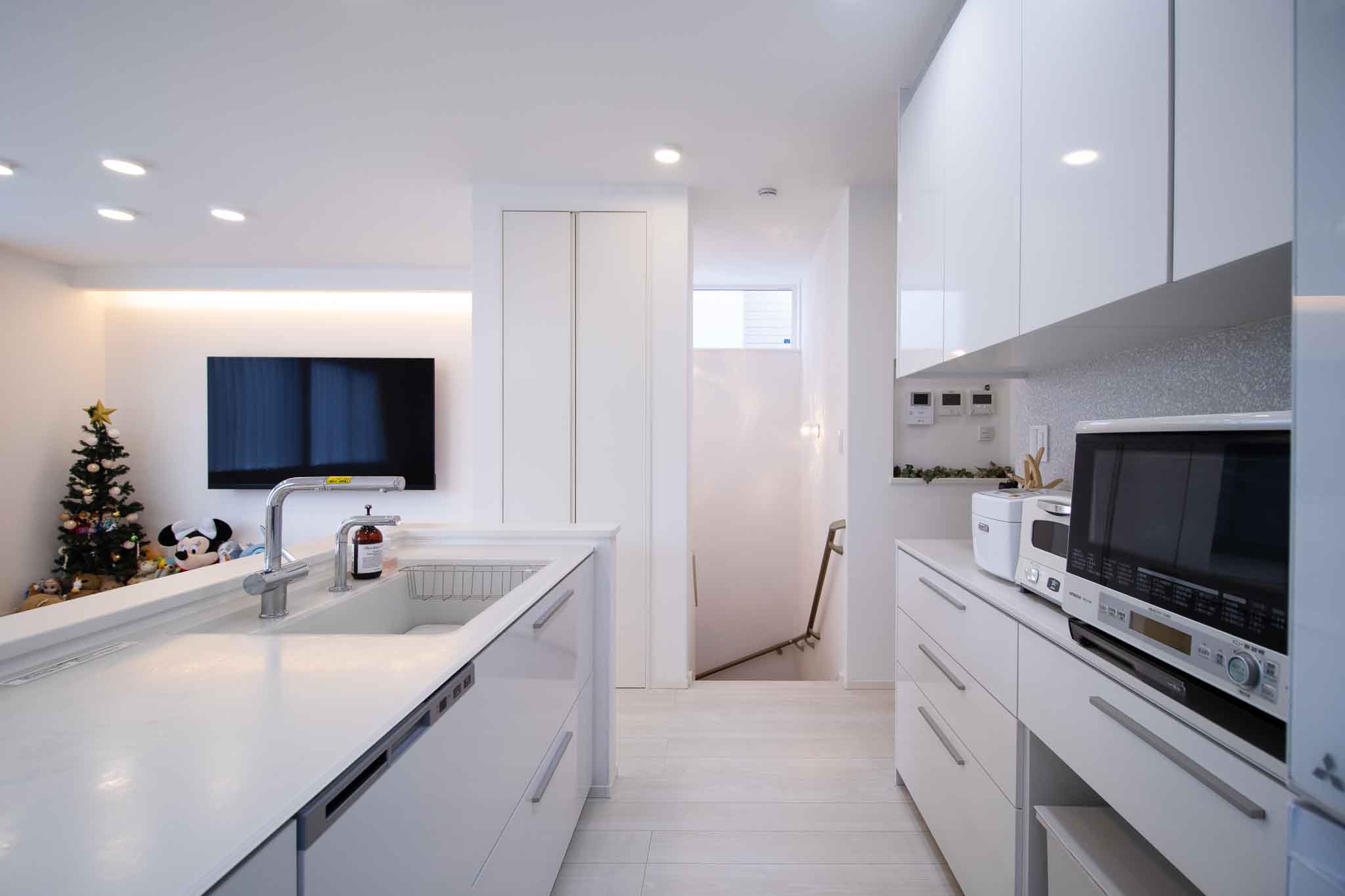 キッチン:キッチンはクリスタルカウンターを採用し、清潔感溢れるデザインです。タッチレス水栓や大容量の食洗機が備わっており、家事負担を軽減します。背面には同色のカップボードが設置され、圧迫感のないコーディネートがされています。