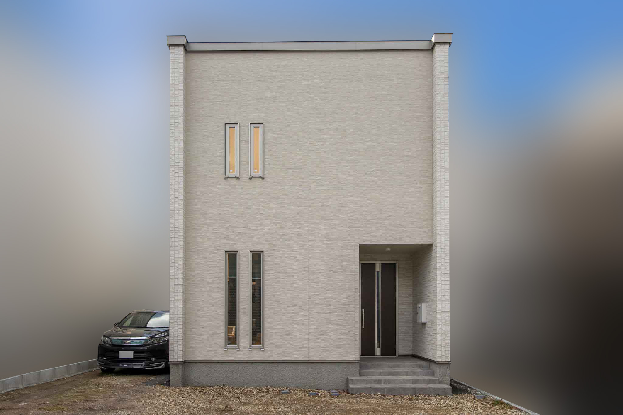 外観:両側面の壁を正面の壁よりも突出させることで、正面のファサードがアクセントとなるデザインです。上下左右対称に設けられた窓がシンプルなファサードデザインを整え、メインの外壁はソルホワイト、アクセントとしてアッシュベージュを使用し、軽やかな印象を与えています。
