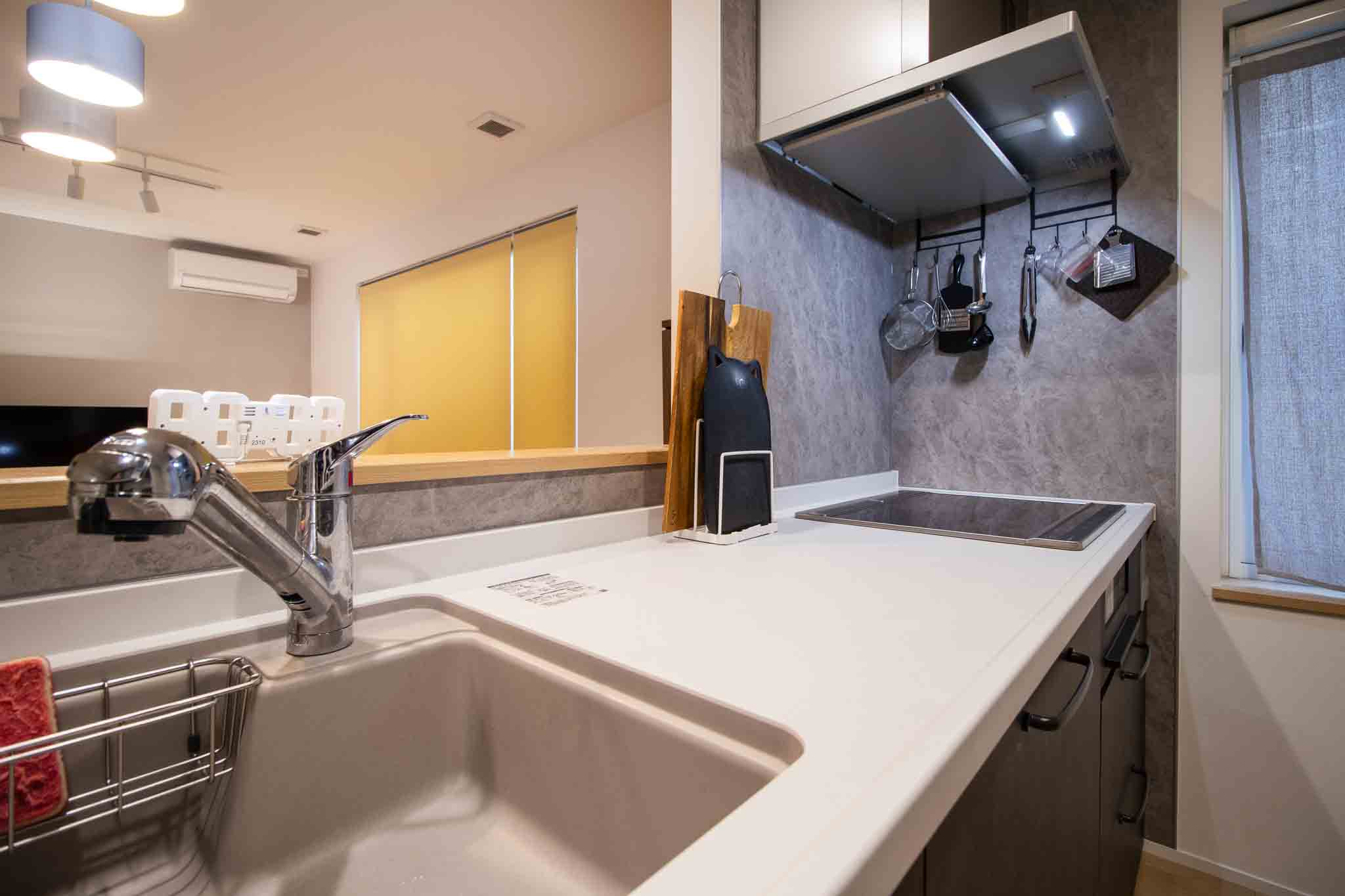 キッチン:キッチンはグレーの石目調デザインで統一され、ヴィンテージテイストが特徴です。ワークトップやシンクもグレー系で揃えられており、背面には同色のカップボードと可動棚付きのパントリーが設置されているため、実用性と美しさを兼ね備えた空間になっています。