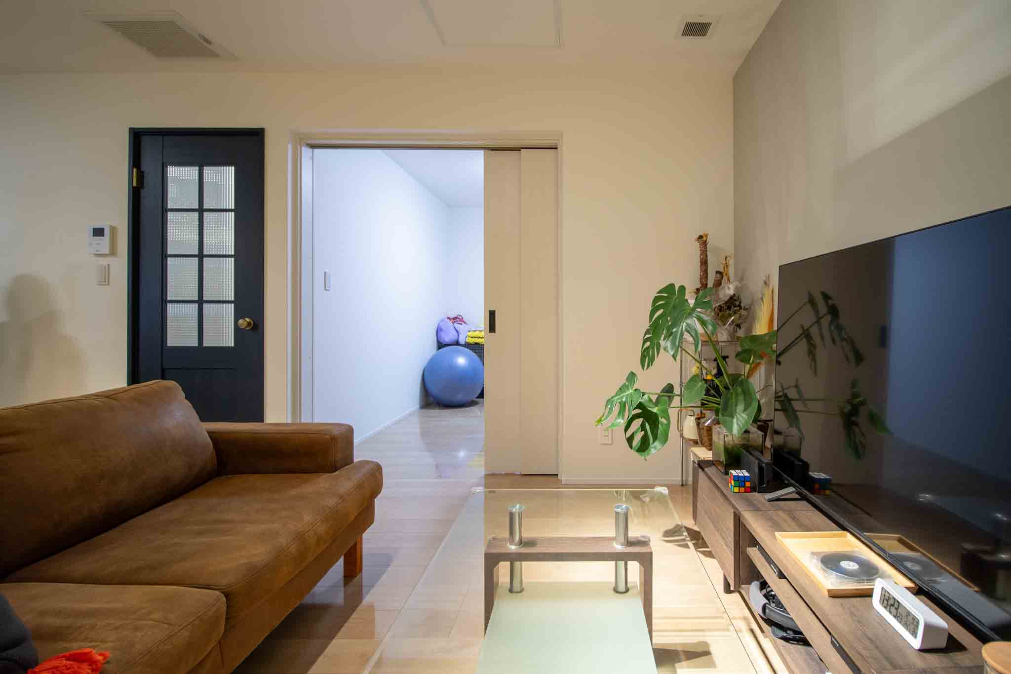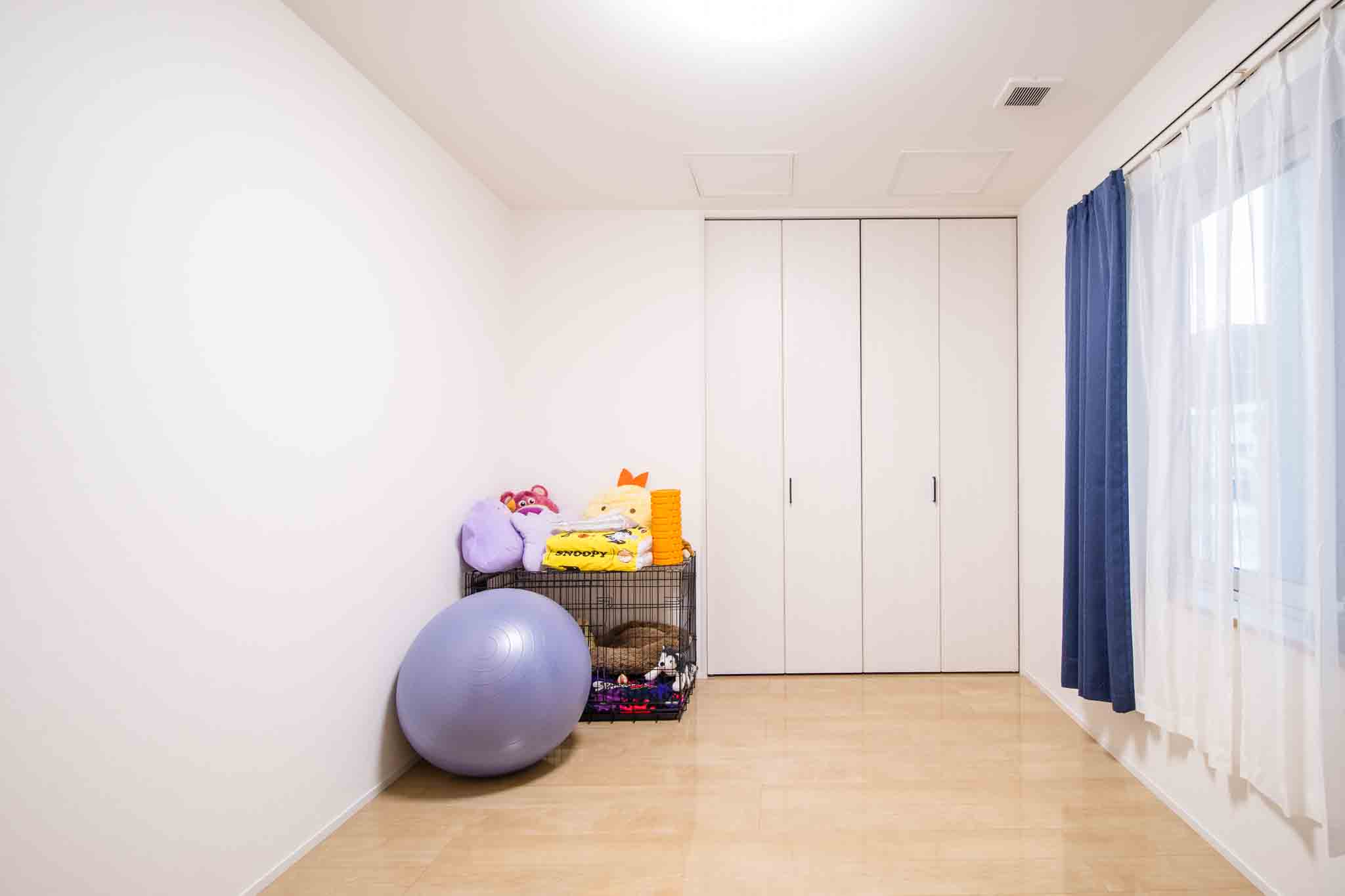 1F洋室:リビングに続く5.9帖の洋室は客間としての利用はもちろん、引き戸を開放することでリビングと一体化し、キッズスペースとしても活用可能です。引き戸を開けることで、LDKの空間をより広く使えるため、家でゆっくりとくつろぐことができます。