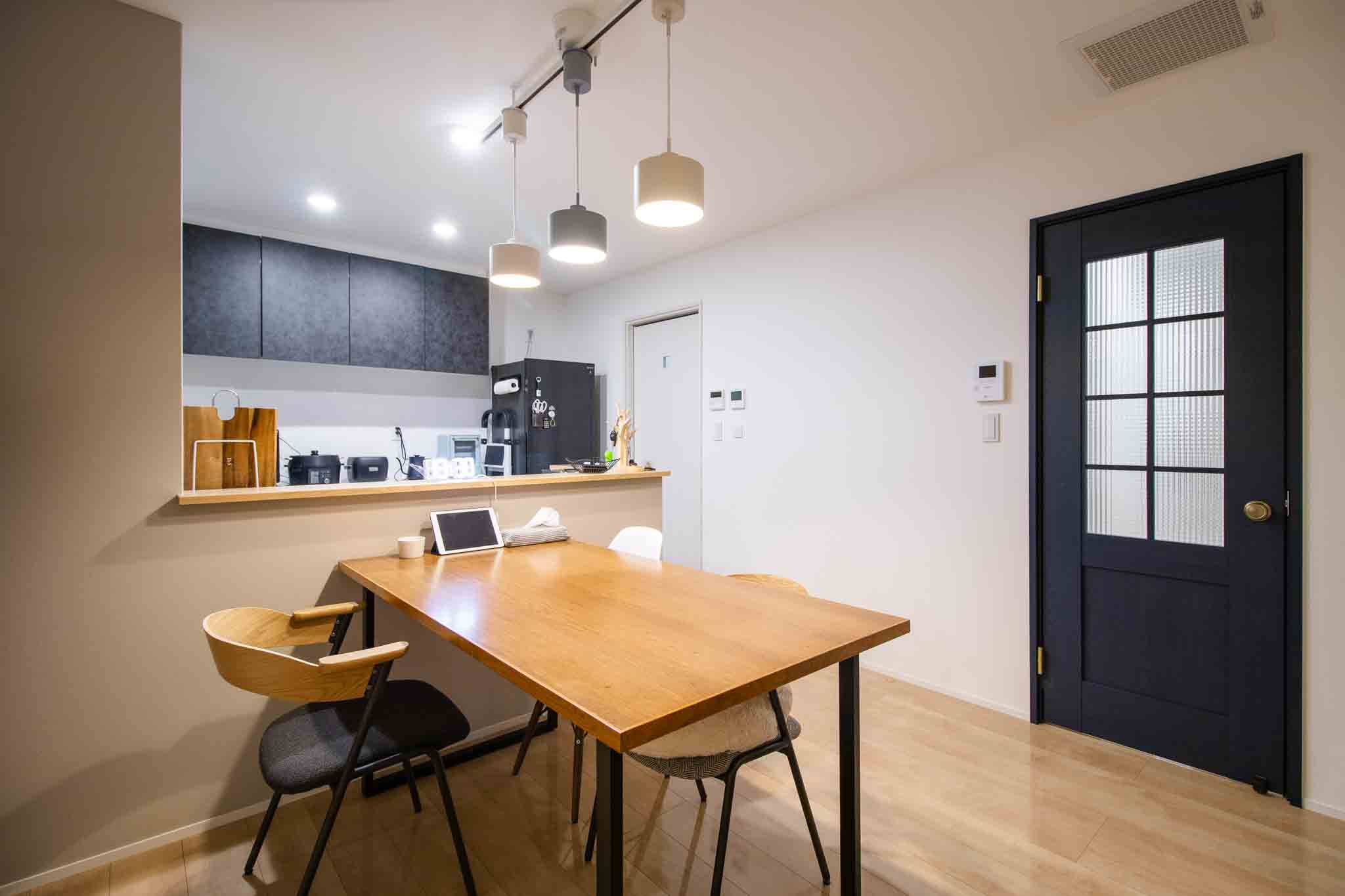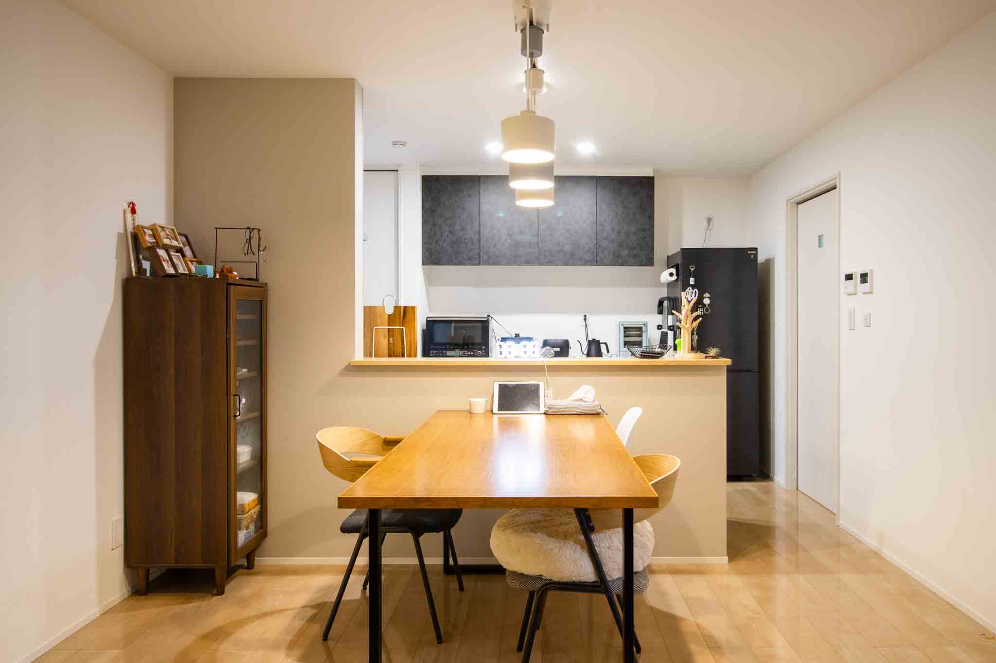 ダイニング:対面式のダイニングキッチンは、キッチンの腰壁に設けた笠木を利用することで、配膳や片付けがスムーズに行えます。ダイニングテーブルは家具職人による特注品で、住まい全体の雰囲気にぴったりマッチした素敵な空間を演出しています。