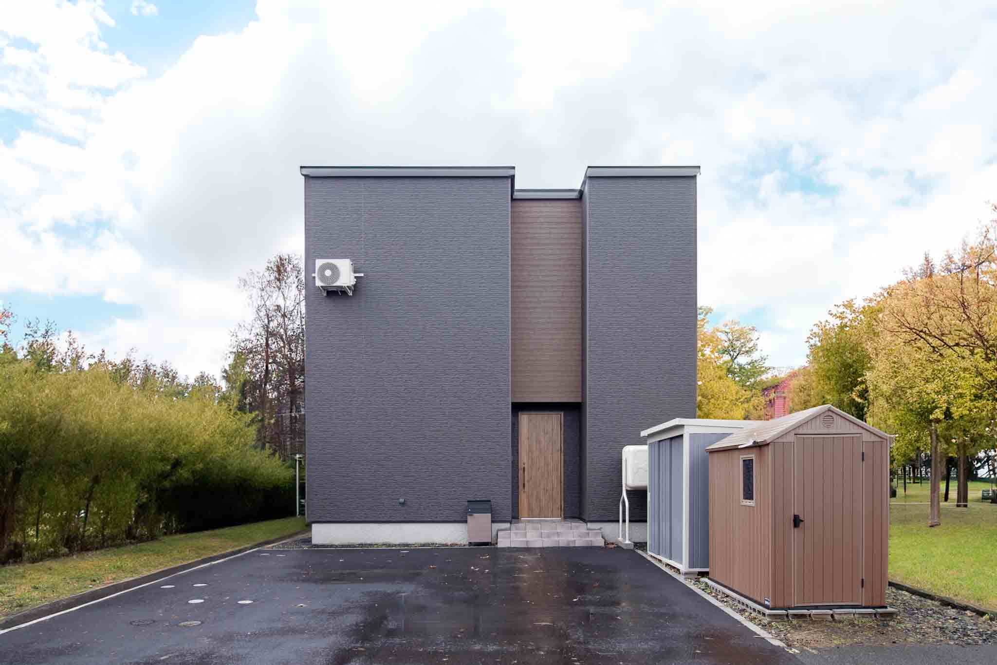 外観:正面には窓を設けず、メインの外壁にはブラック、エントランス上部には木目柄のパネルを使用しています。屋根や窓サッシもブラックで統一され、スタイリッシュな外観となっています。
