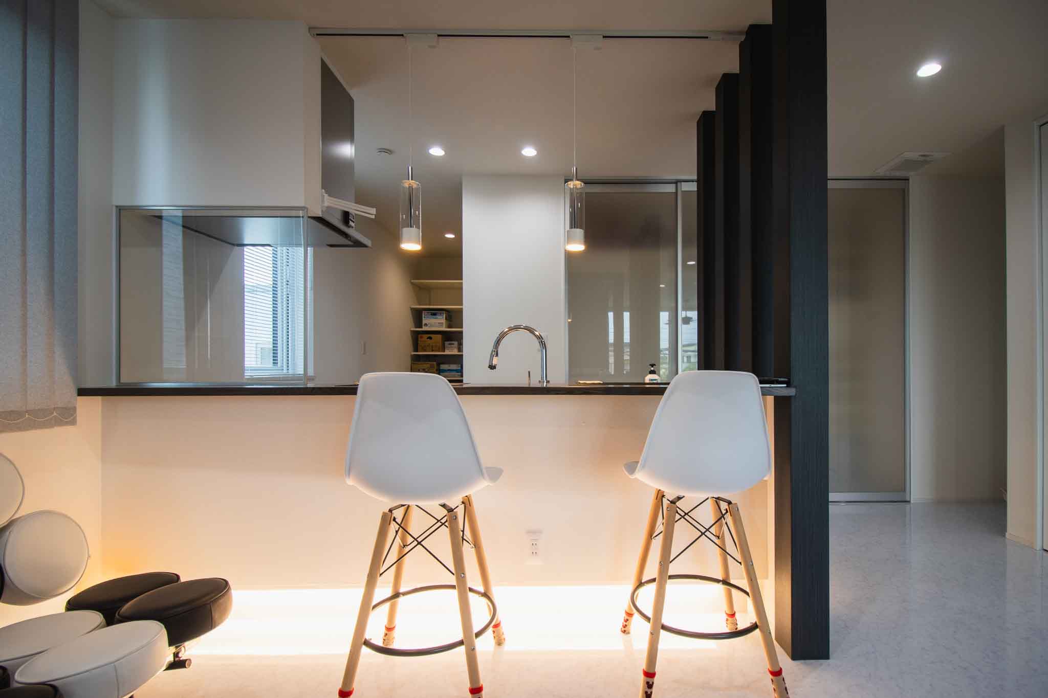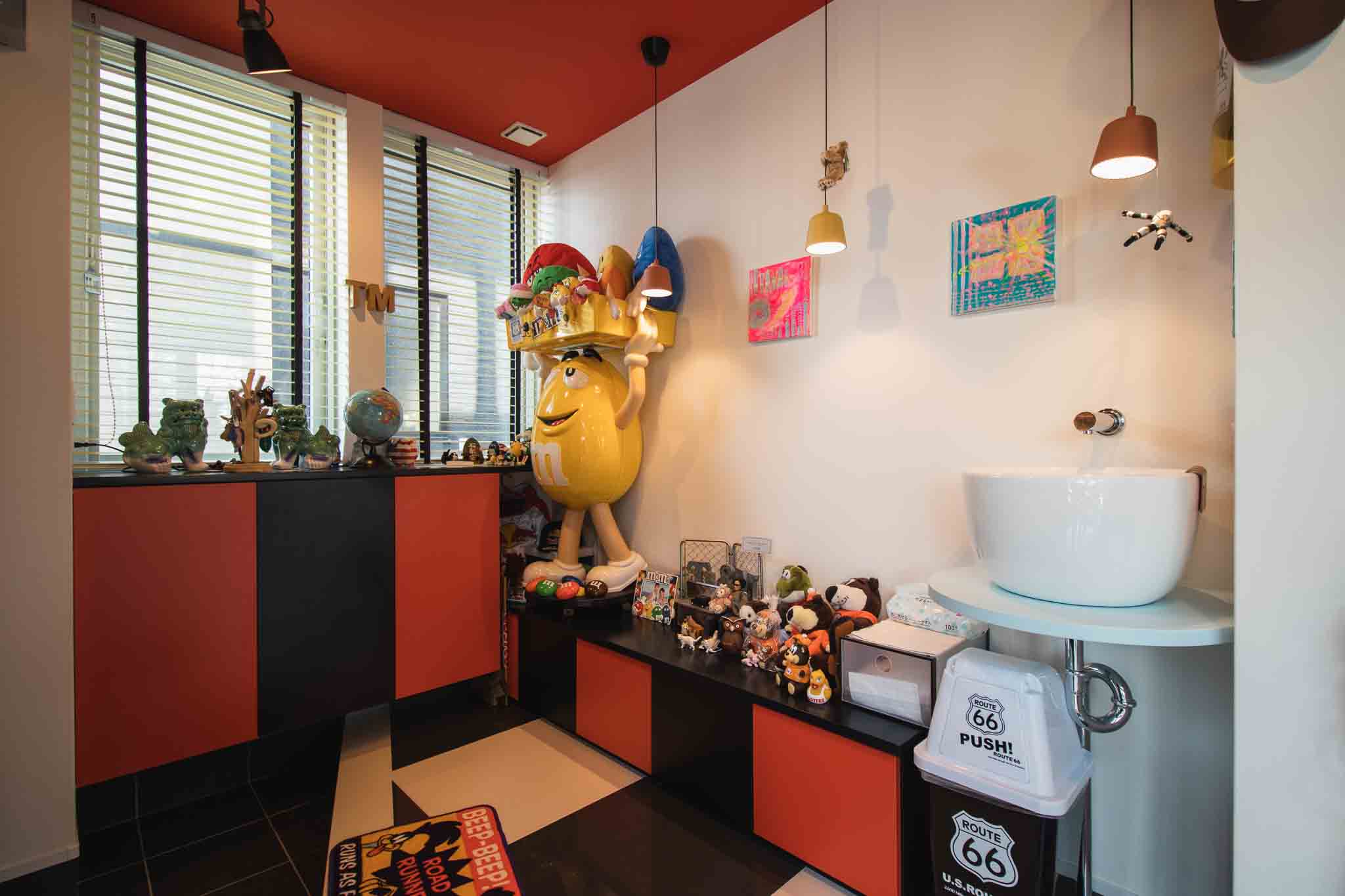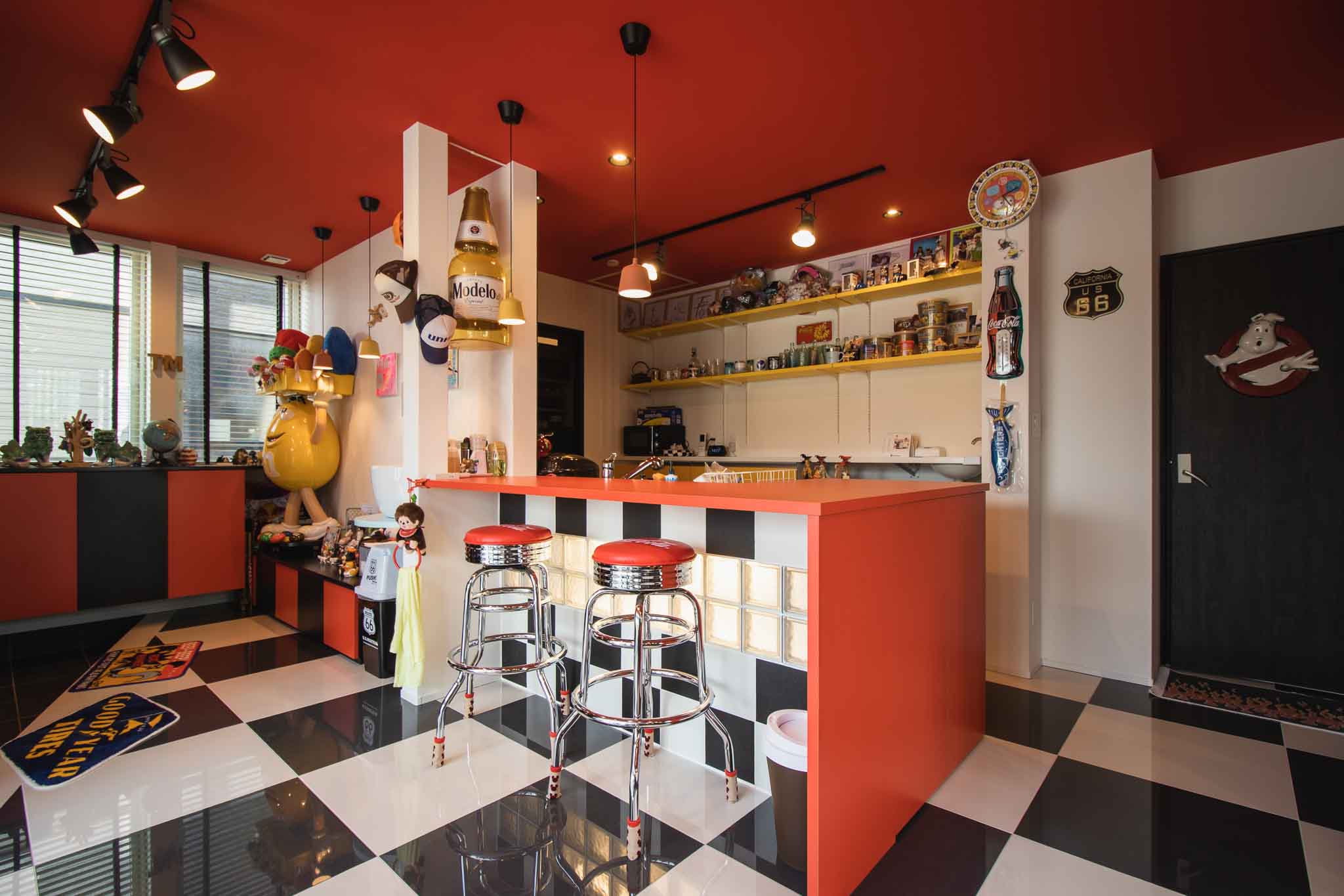 1Fキッチン:アメリカンダイナー風の色使いが特徴的な対面式キッチン。カウンター下部はチェッカー柄とガラスブロックでデザインされ、間接照明がカフェのような雰囲気を演出します。キッチンからは部屋全体を見渡せ、ファインレッドの扉がスタイリッシュです。