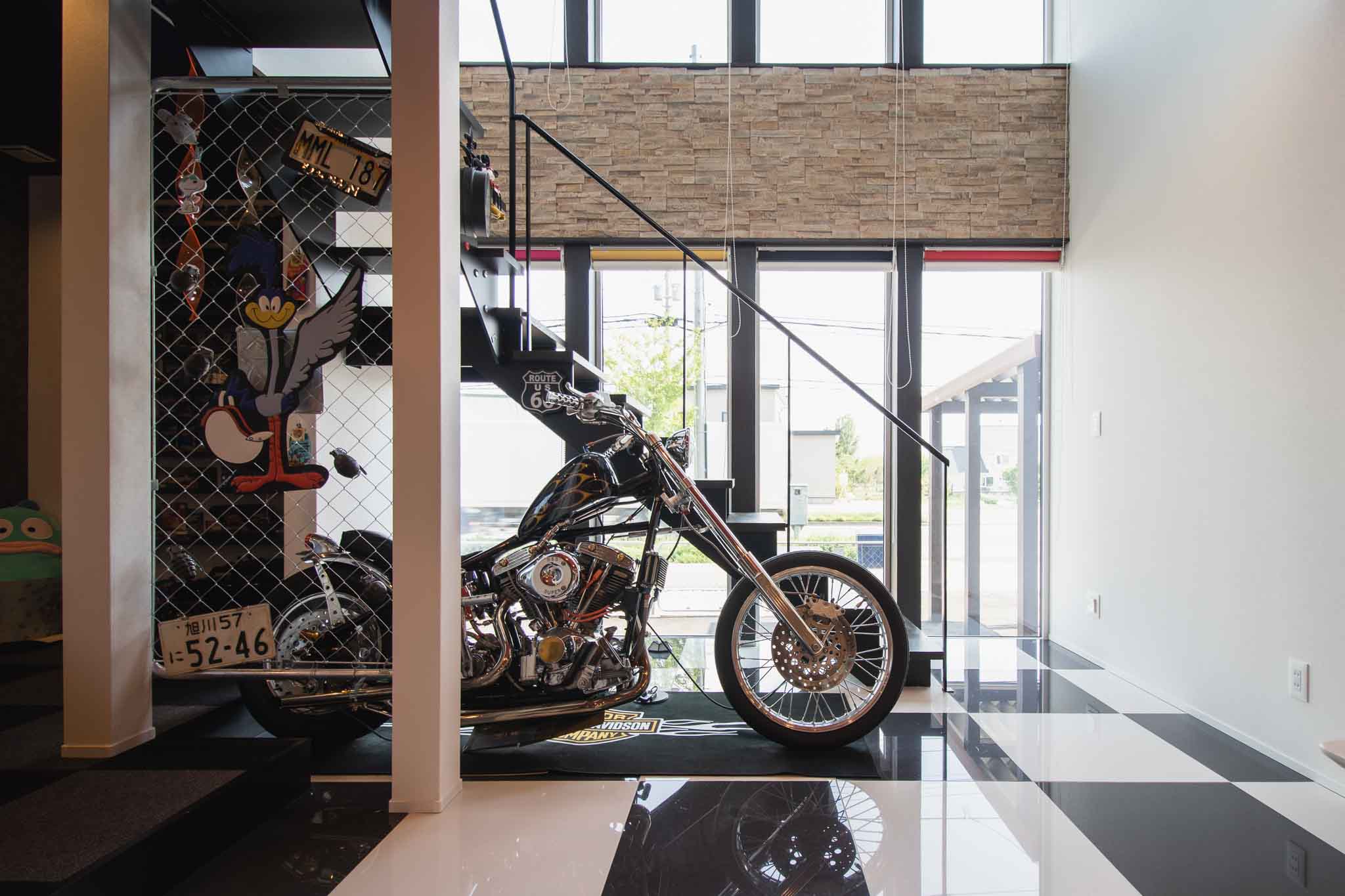 階段・吹き抜け:素材にこだわった明るい吹き抜け空間。ブラックのスケルトン階段と高級感のあるタイル壁が、空間に奥行きを与えます。フェンスや名古屋モザイクのタイルが、細部までテーマを表現しています。
