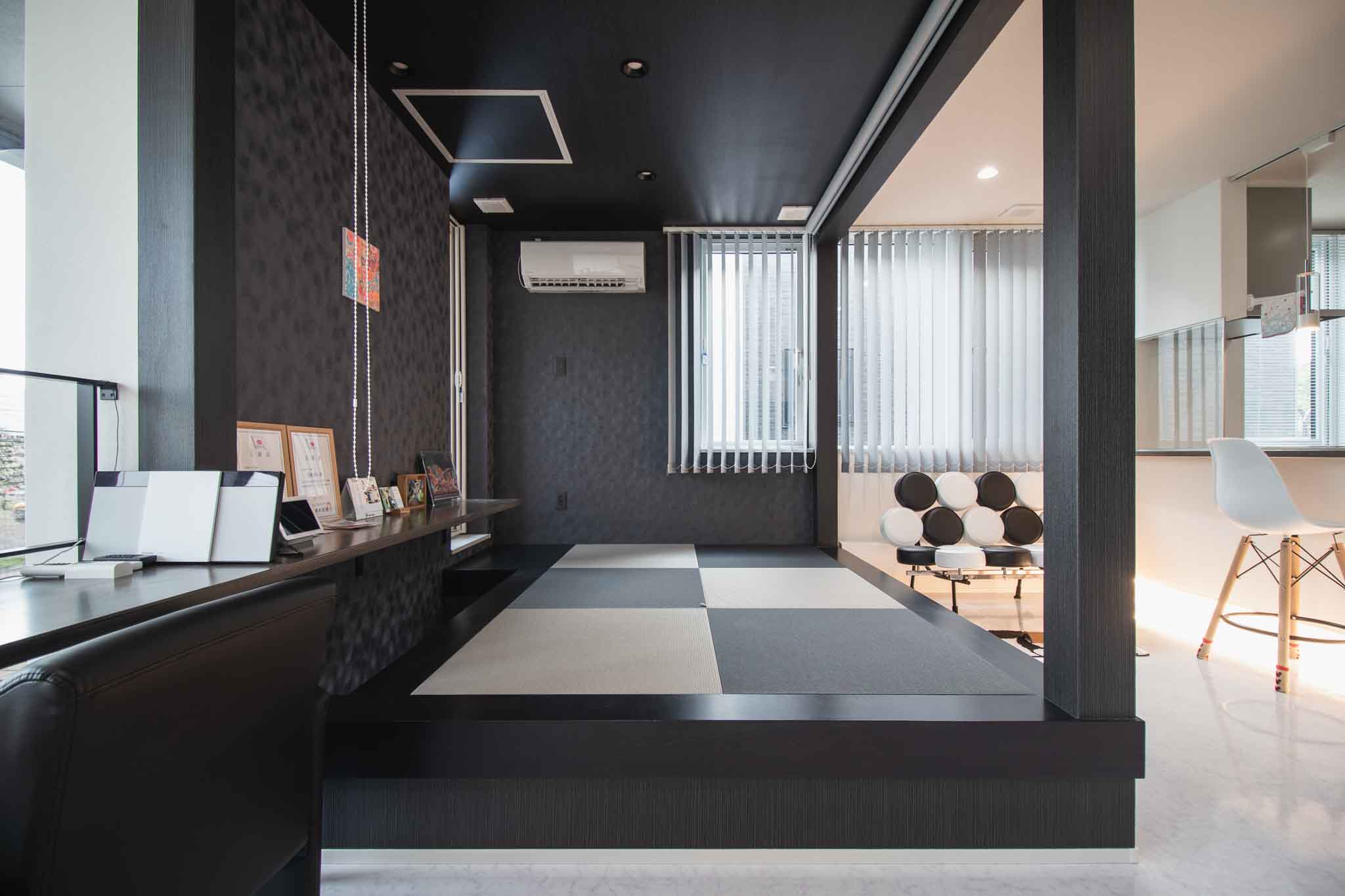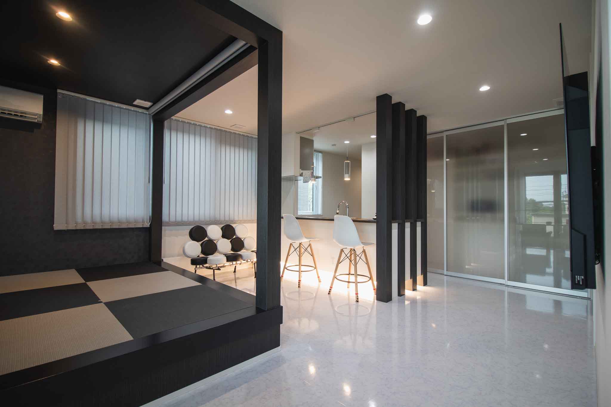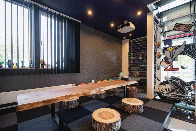 小上がり: セカンドリビングの一角に設けられた小上がりスペースには、ダークトーンのチェッカー柄カーペットタイルとブラックの天井が採用され、空間に落ち着いた雰囲気をもたらします。プロジェクターが設置されており、リビングと緩やかにつながりながらも、趣味やくつろぎの場として独立した使い方も可能です。