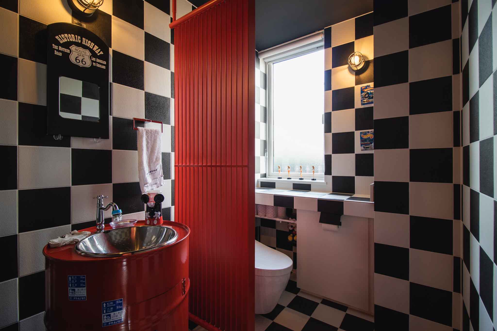 トイレ:ドラム缶型の手洗い器が特徴的なトイレ。ブラックとホワイトのタイルでチェッカーパターンを描き、仕切りにはパネルヒーターを使用しています。照明にはマリンライトを採用し、こだわりのデザインが感じられます。