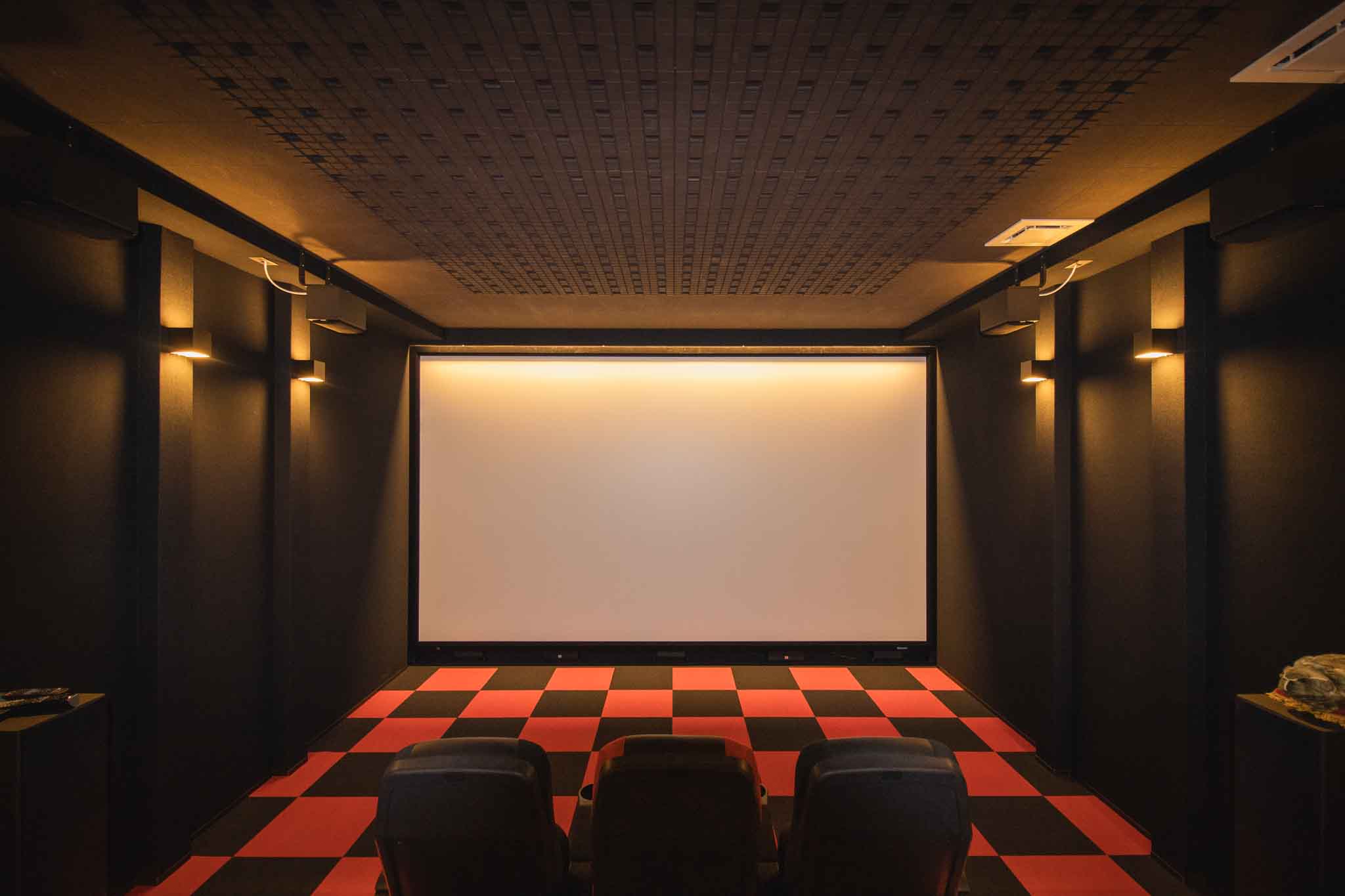 シアタールーム:24.8帖の大空間には巨大スクリーンと二列のシート、防音仕様の壁と床が備わっています。ブラックとレッドのカーペットタイルで、本物の映画館のような雰囲気を楽しめます。