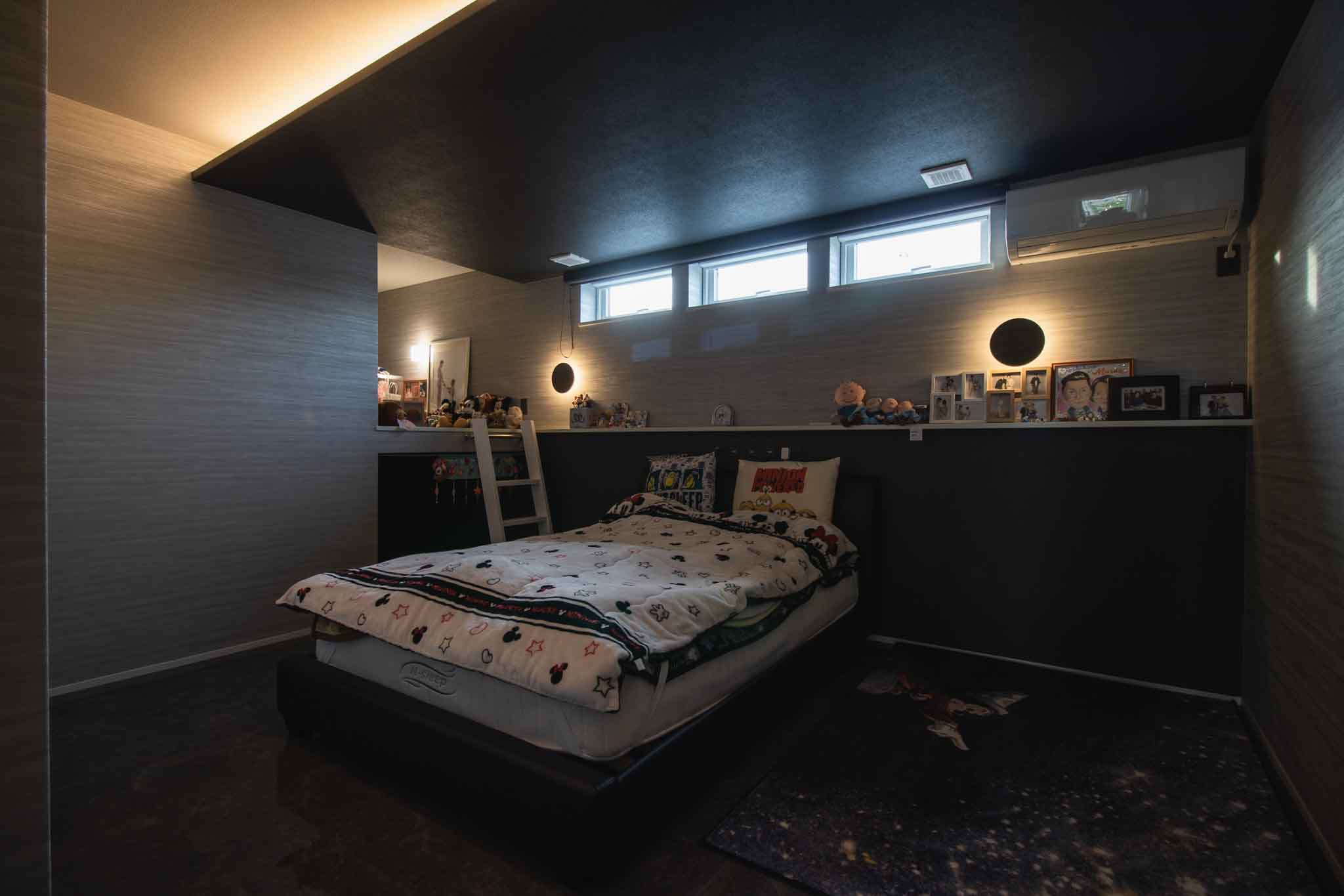 寝室:ロフト収納と5.5帖のウォークインクローゼットがあり、十分な収納スペースを確保しています。下がり天井と丸い照明が落ち着いた雰囲気を引き立てます。