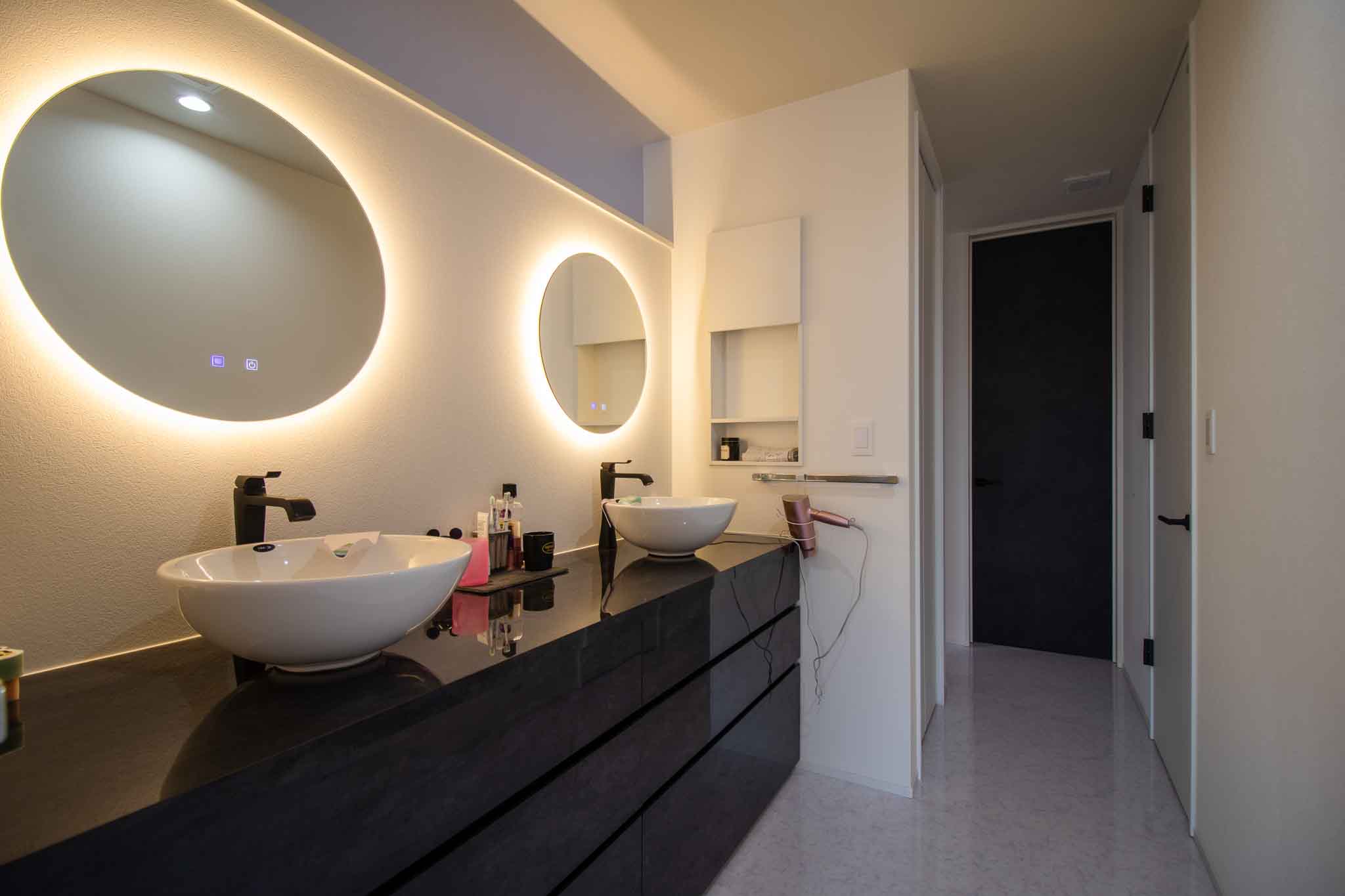 洗面スペース:大理石調のカウンターと引き出し収納の上には、2つの洗面ボウルと間接照明付きのミラーがあり、ホテルのような印象を与えます。