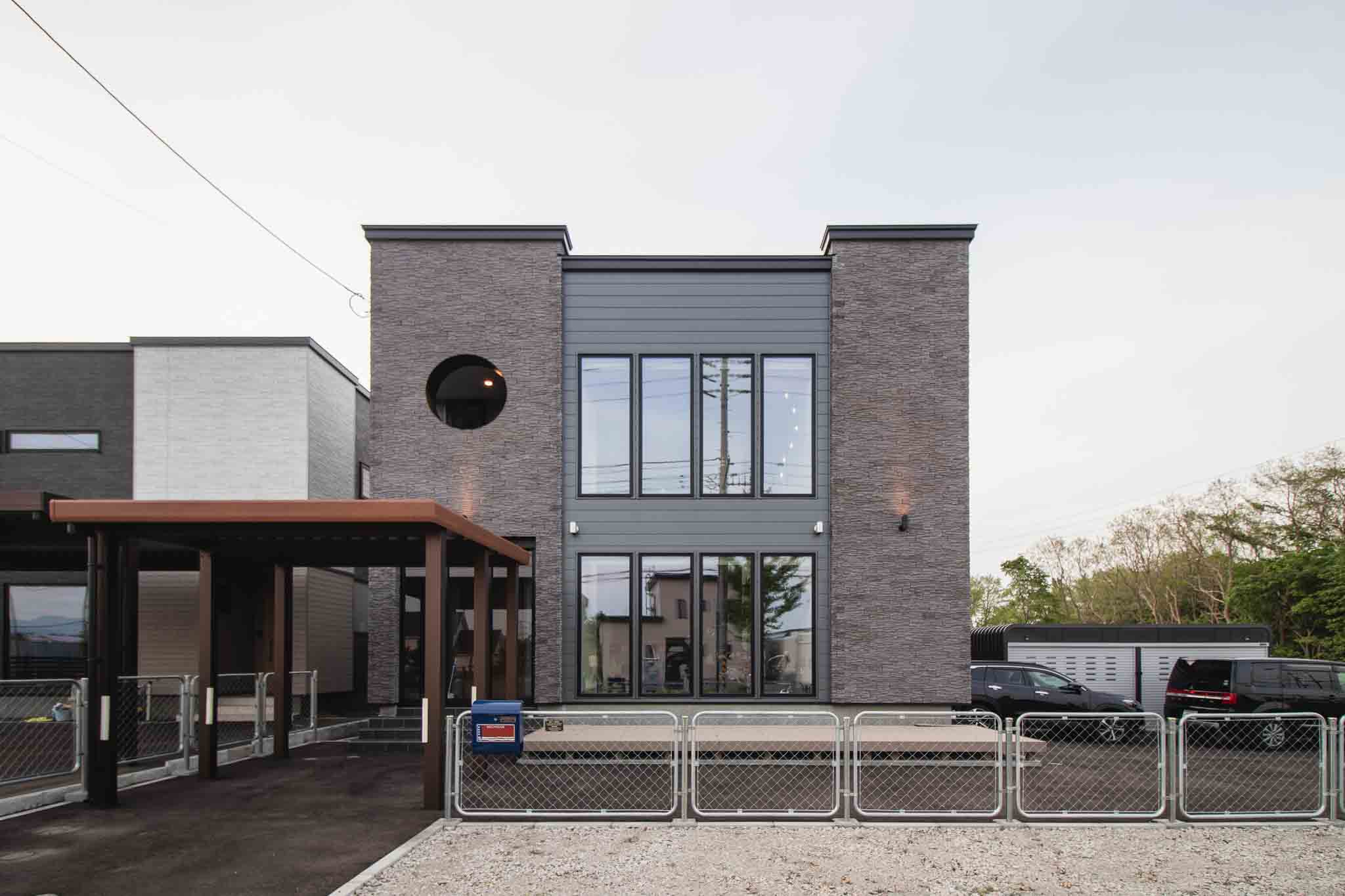 外観:素材が異なる3色でまとめられた存在感のある外観。チャコールメタリックの金属サイディングとゴツゴツとした質感のタイル、木目調のデザインがスタイリッシュで高級感を引き立てます。2階バルコニー部分のサークル型の開口が特徴的です。