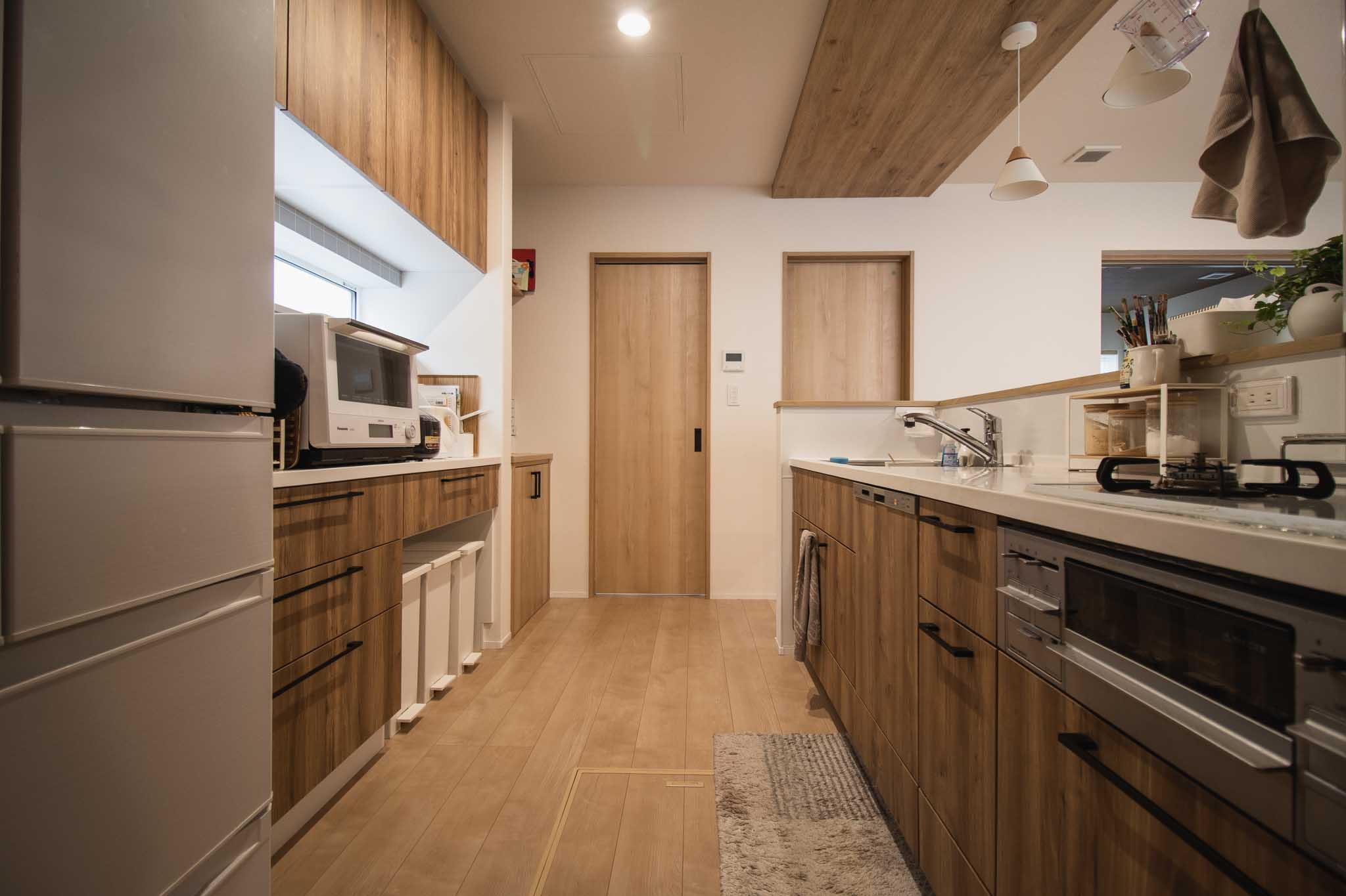 キッチン:キッチンは木目調の下がり天井と扉で家全体と統一されたデザイン。ダイニングやリビング、和室まで見渡せる間取りで、家族の様子を見守りながら家事ができる設計です。
