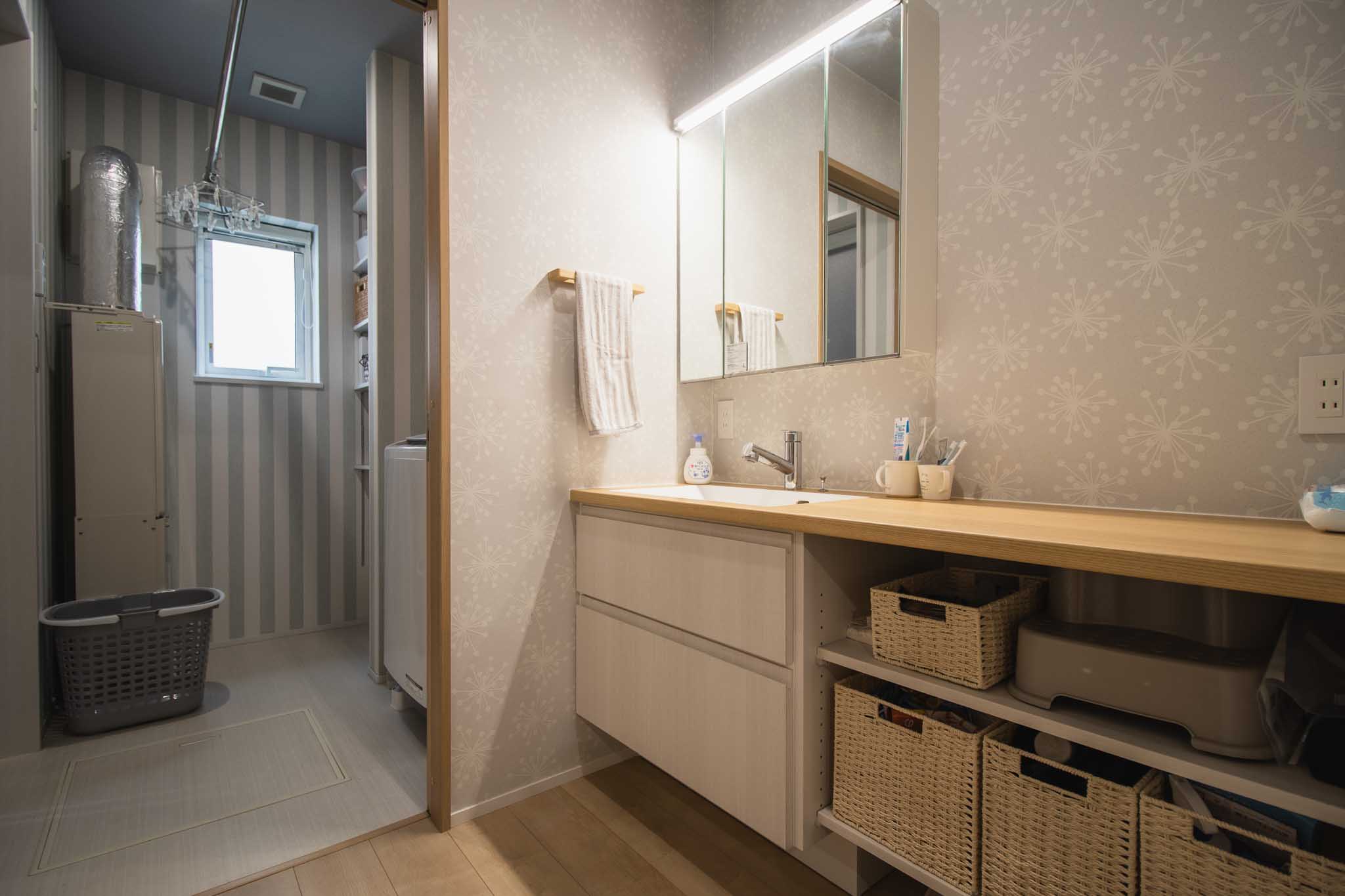 パウダールーム:1.5mのワイドカウンター付きの独立した洗面化粧室。作業スペースが広く、家族全員が快適に使えます。