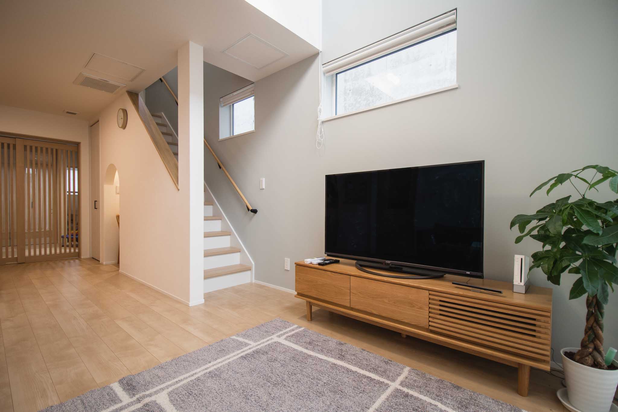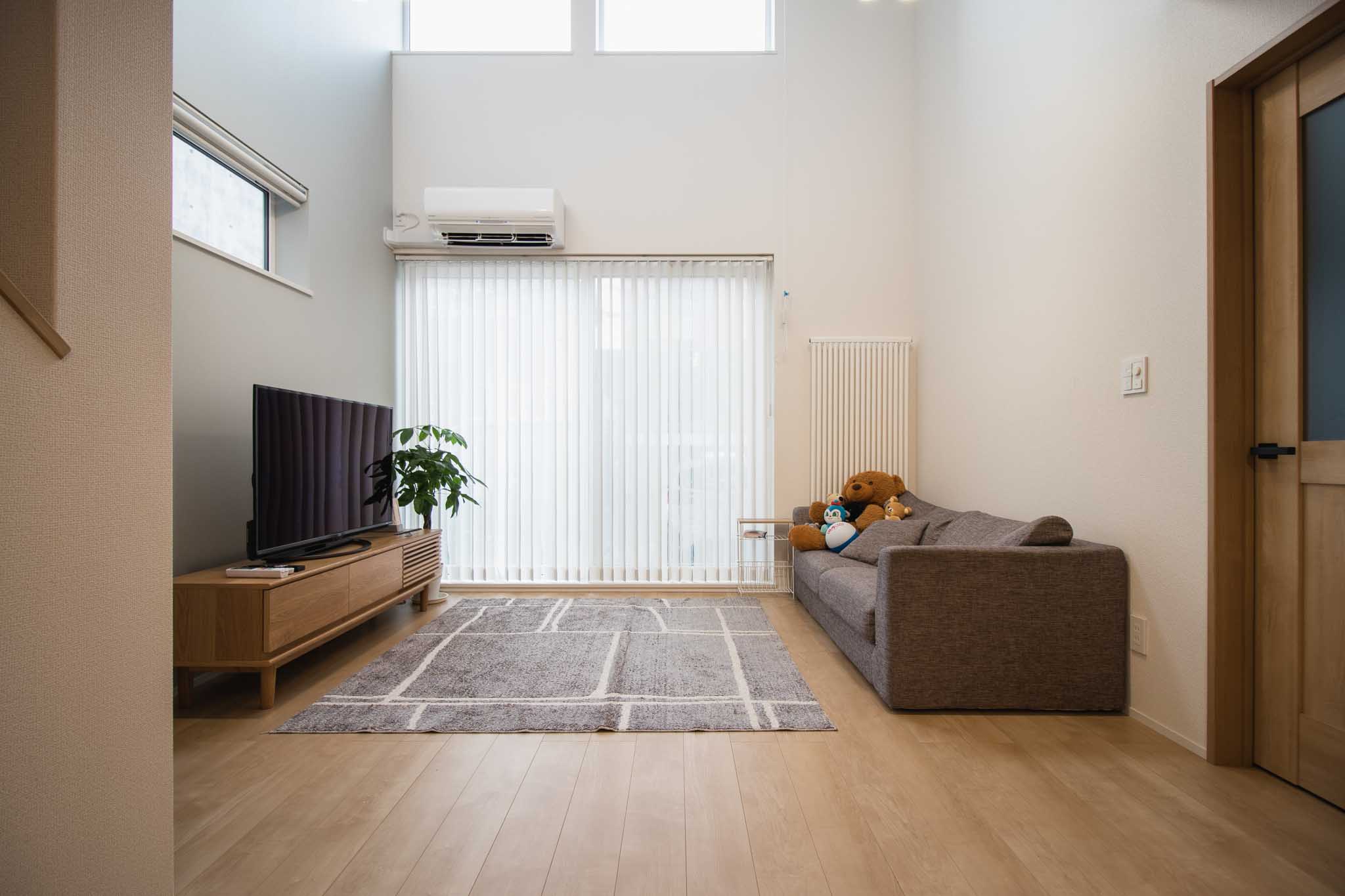 リビング:5帖分の吹き抜けが明るく開放感のあるリビングを実現。充填断熱と外断熱を組み合わせたW断熱工法で、冬も暖かく夏も快適に過ごせます。