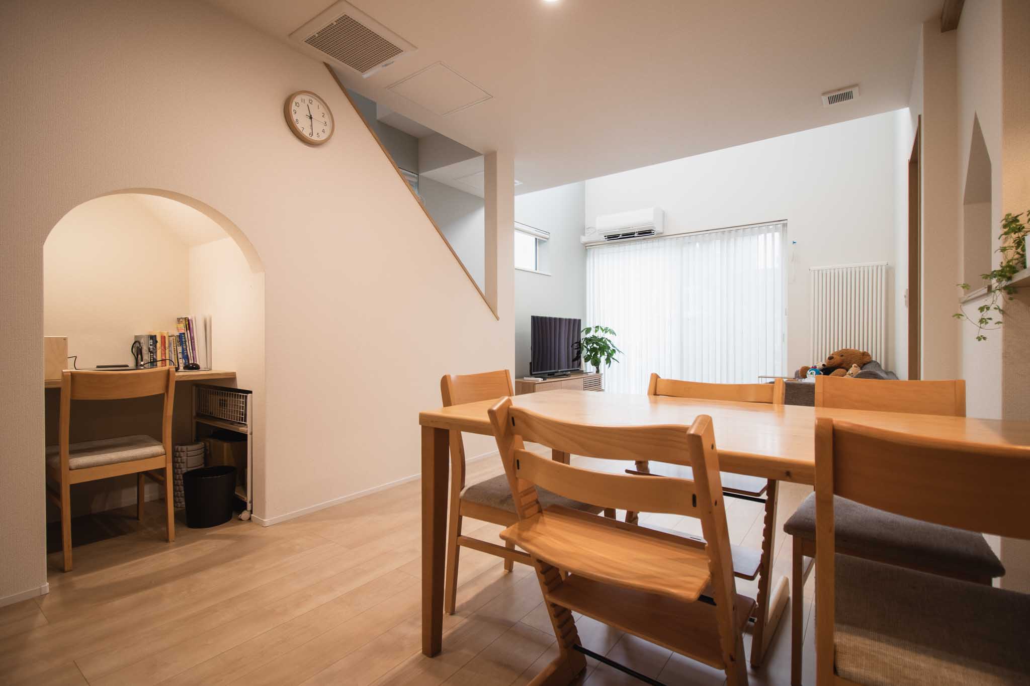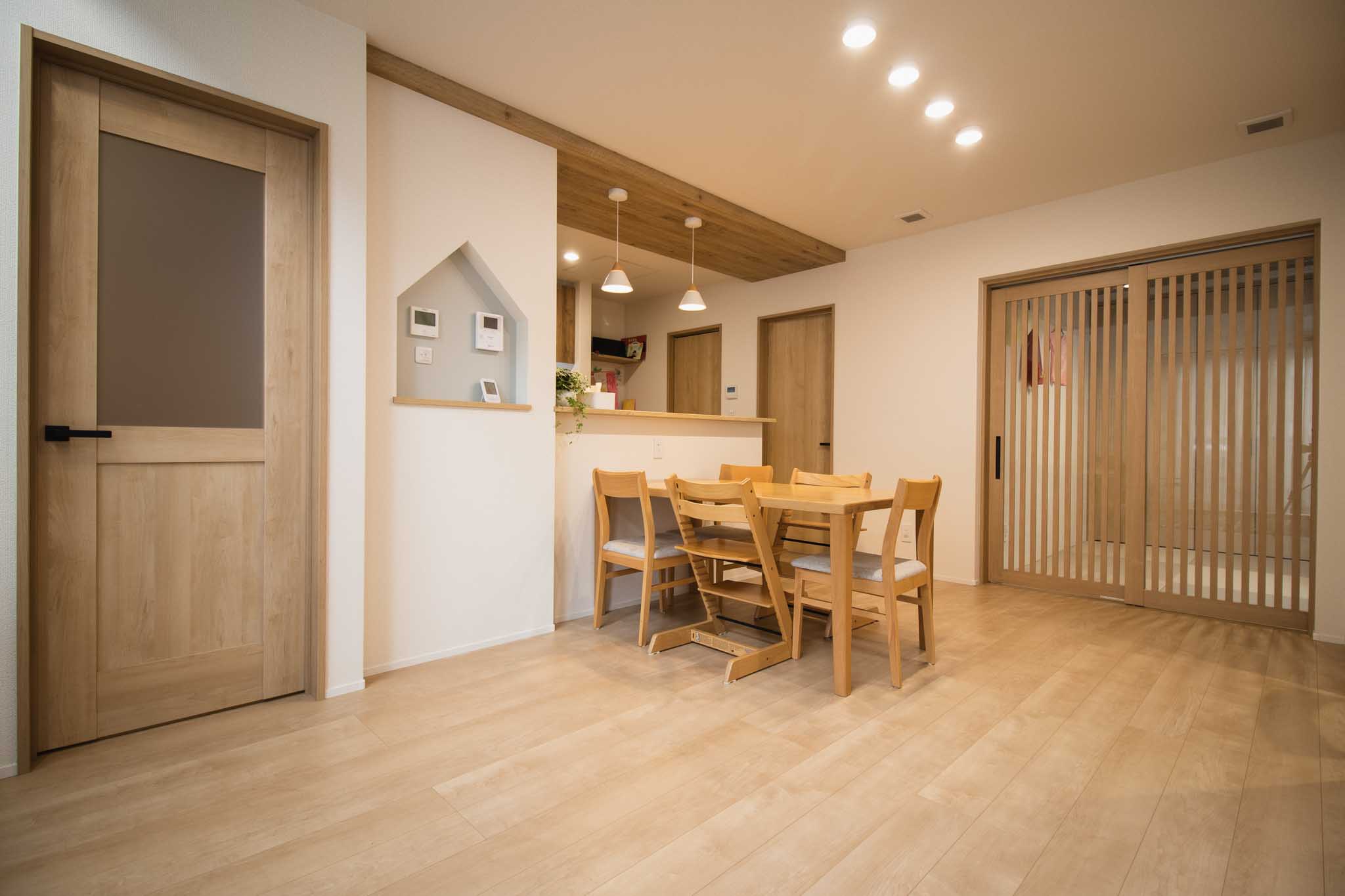 ダイニング:ペンダントライトがカフェのような雰囲気を演出するダイニング。キッチンと対面式で、配膳や片付けがスムーズです。キッチン腰壁の隣には可愛らしいお家型のリモコンニッチがあり、空間のアクセントとなっています。