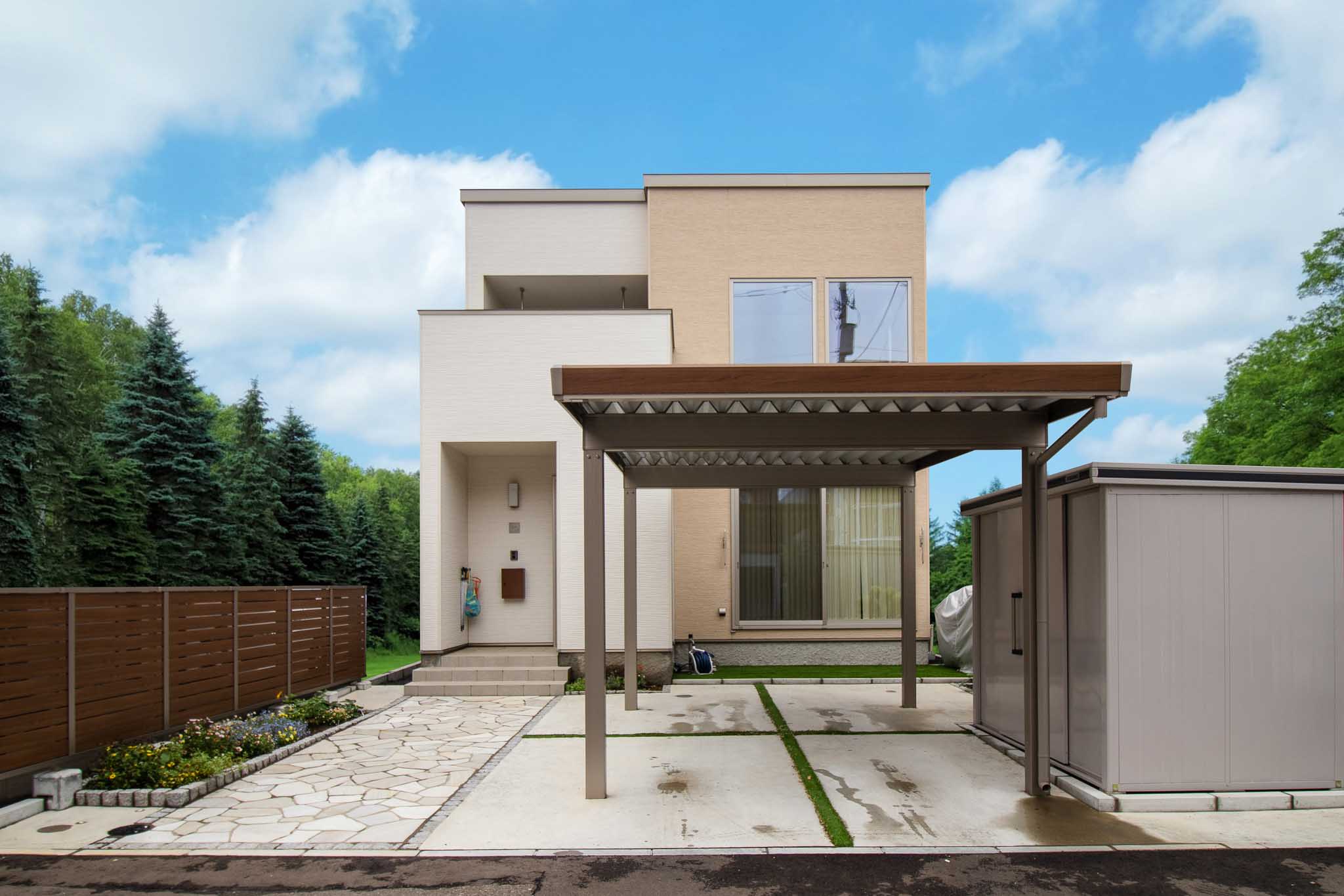外観:ホワイトとベージュの窯業系サイディングが柔らかな表情を演出。シンプルながら洗練された外観が特徴です。