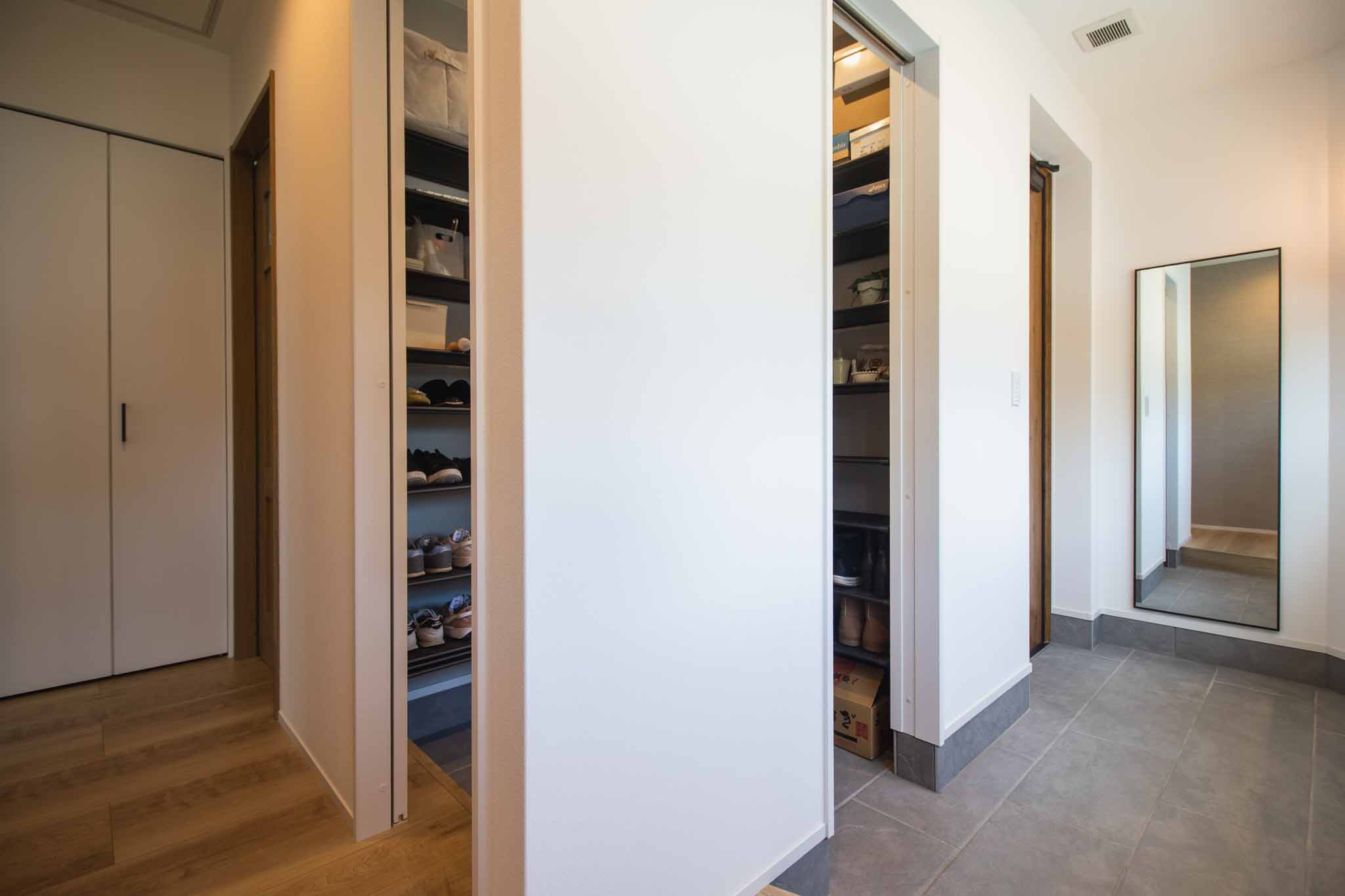 玄関:L字型の玄関は、正面が壁となっているため、来客時にプライベートスペースが見えにくい設計です。扉付きのシューズクローゼットは、ホールからもアクセスできる2WAY仕様で、動線を分けられます。