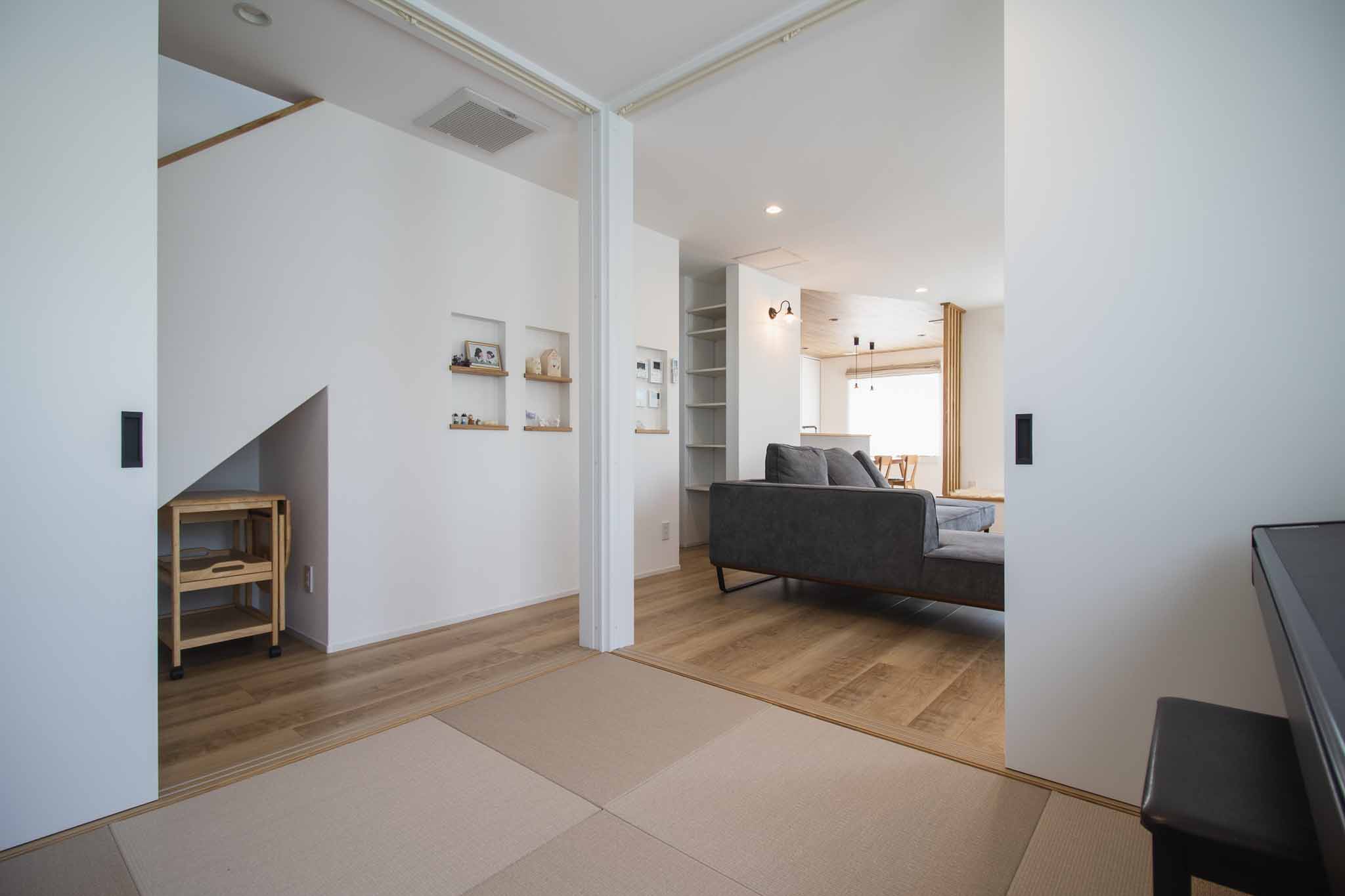 和室:リビングに隣接する4.5帖の和室は、引き戸を開放するとリビングと一体化し、広々とした空間として利用できます。キッズスペースや客間としても活用可能です。