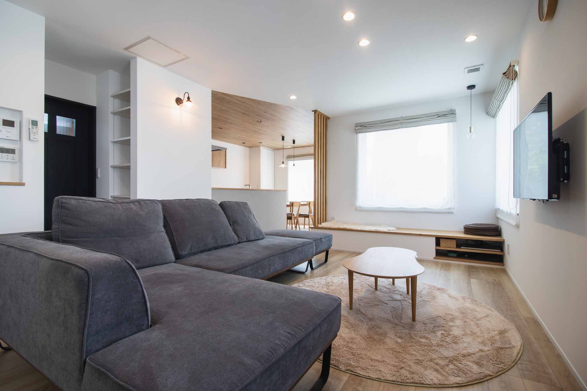 LDK:24.4帖のLDKは、リビングとダイニングが半独立しており、空間にゆとりを感じさせます。リビングは大きな窓が多く、明るく開放的な空間です。ベンチ下収納もあり、使い勝手が良いです。
