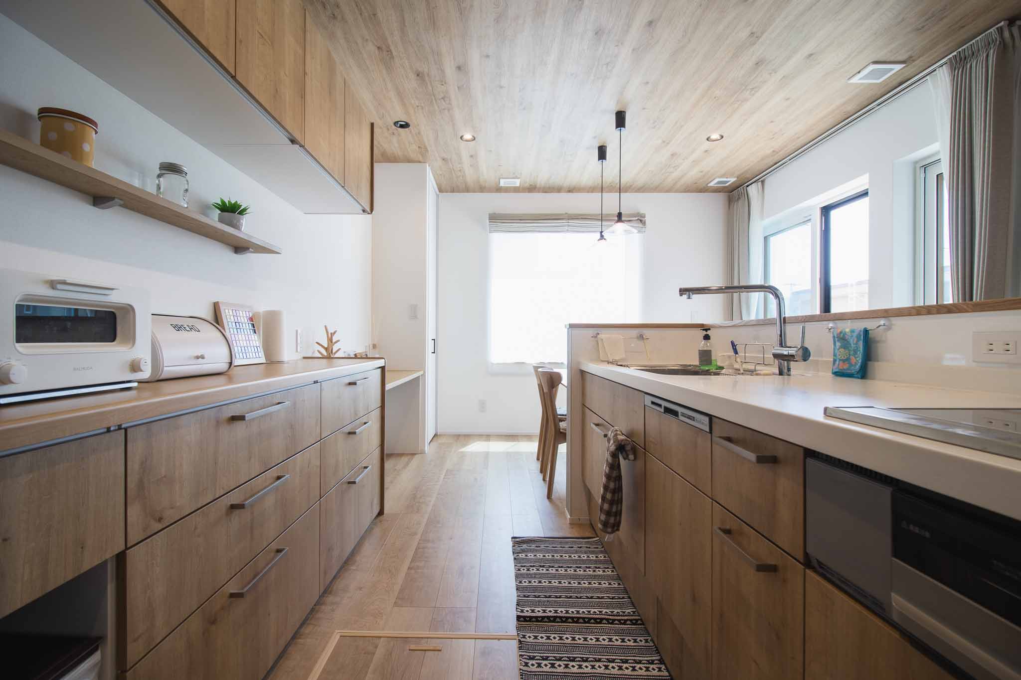 キッチン:キッチンはリビングと対面、ダイニングと横並びの配置です。広々としたカウンターと充実した収納スペースがあり、家事がしやすい設計です。