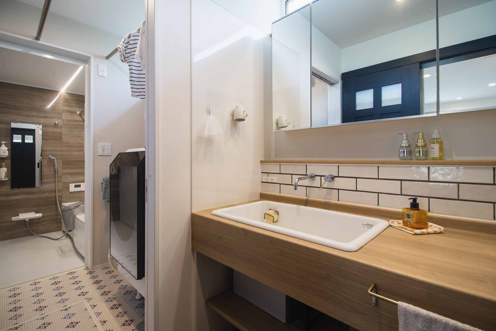 パウダールーム:独立式の洗面室は、造作の洗面化粧台が特徴です。洗面ボウルとカウンターはスタイリッシュで、清潔感のある空間です。