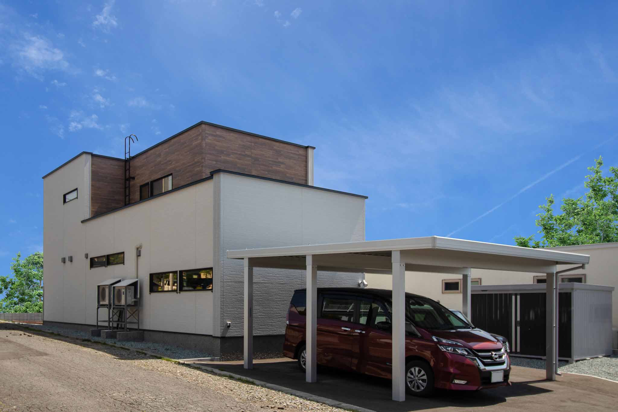 外観:3種類のサイディングを組み合わせた外観は、プラシス柄のオータムホワイト、カーロ柄のスローグレー、ブルレウッド柄のブルレチタンアンバーで構成され、ナチュラルで温かみのあるデザインです。土台水切や窓サッシなどの部材はブラックで統一され、全体のまとまりを持たせています。