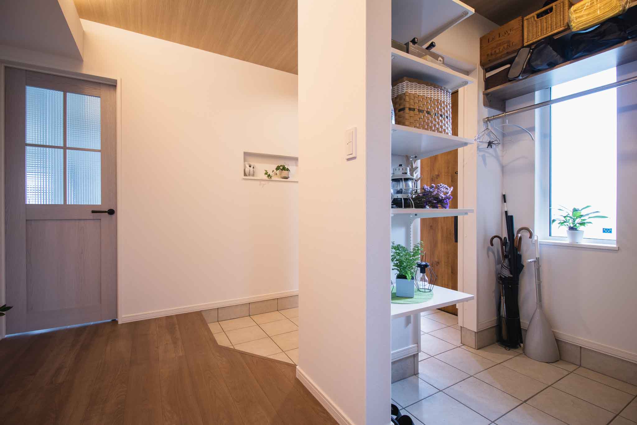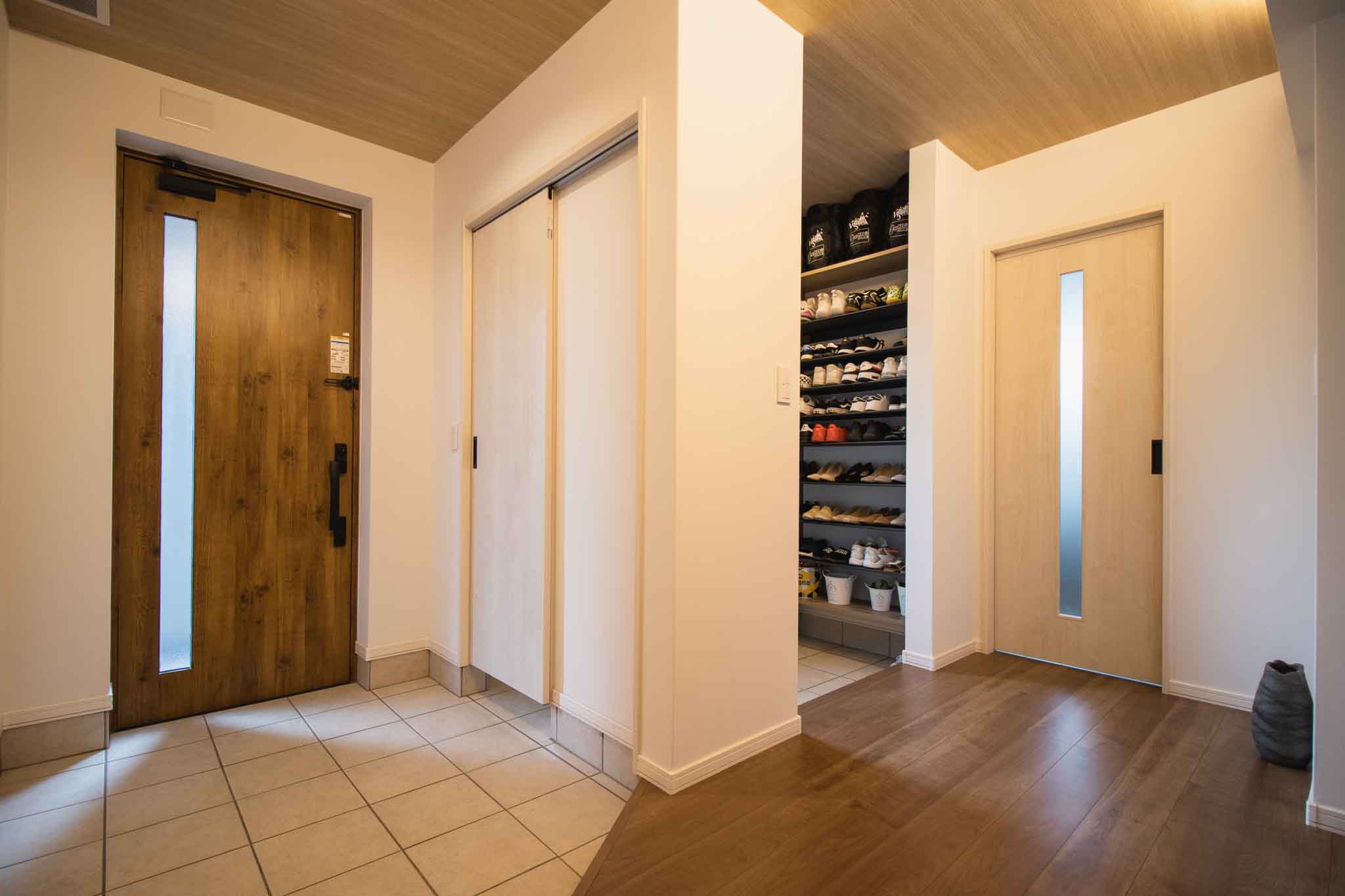 玄関:柔らかな間接照明と下がり天井が特徴の玄関。ホワイトのタイルと木目調の天井クロスが爽やかな印象を与えます。シューズクローゼットとホールへは2WAYでアクセス可能です。