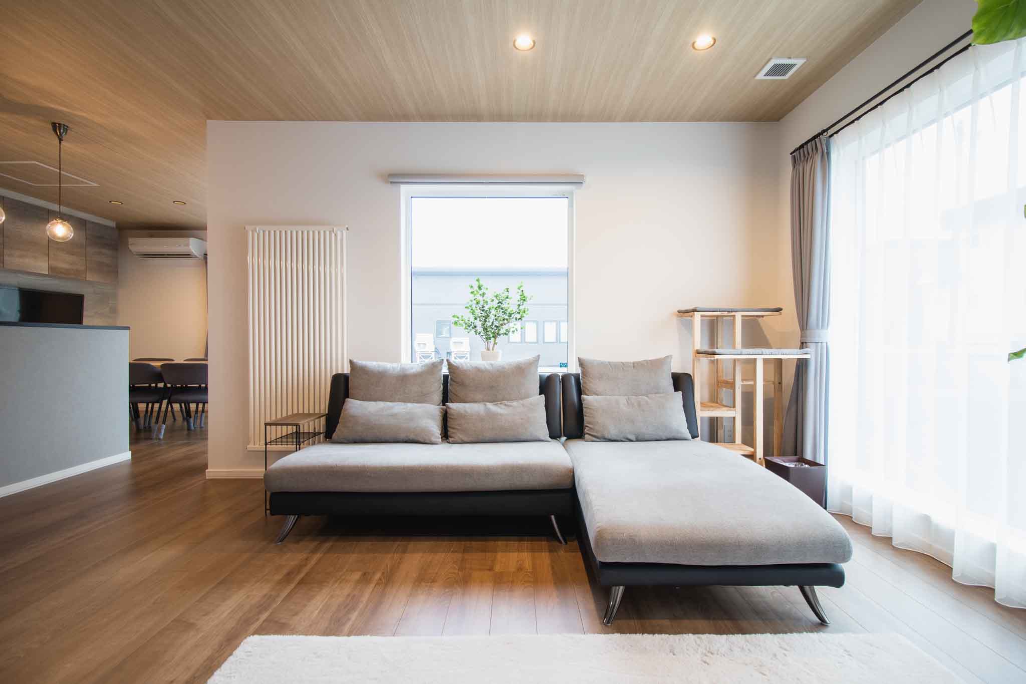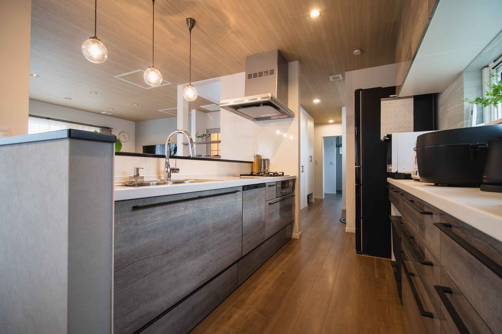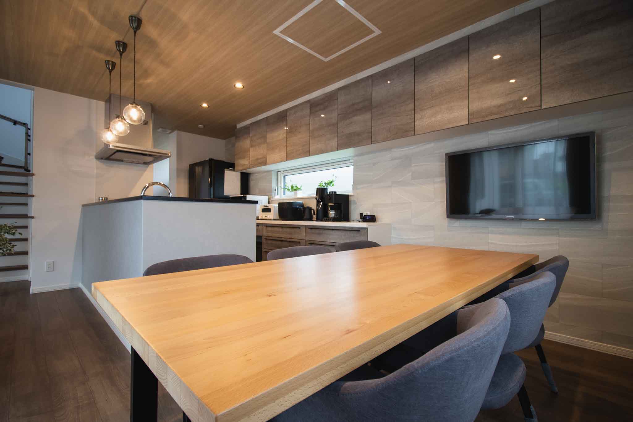 LDK:22.8帖の広々としたLDKは、木目調のフローリングと天井が北欧テイストを演出。グレイッシュなアクセントクロスと対面キッチン、横並びのダイニングが家事効率と家族のコミュニケーションを高めます。