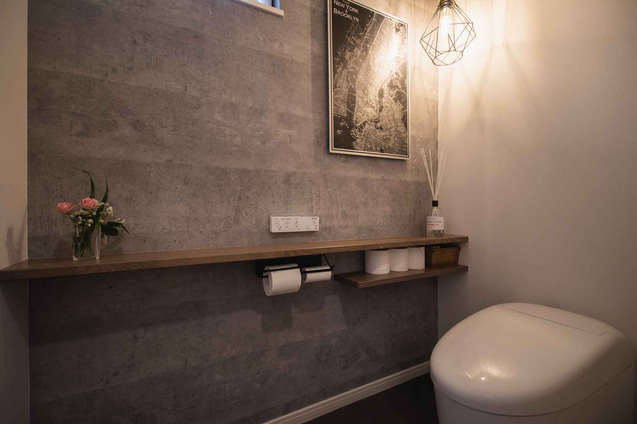 トイレ:ダークカラーのクロスが落ち着いた印象を与えるトイレ。タンクレストイレでスッキリとしたデザインです。