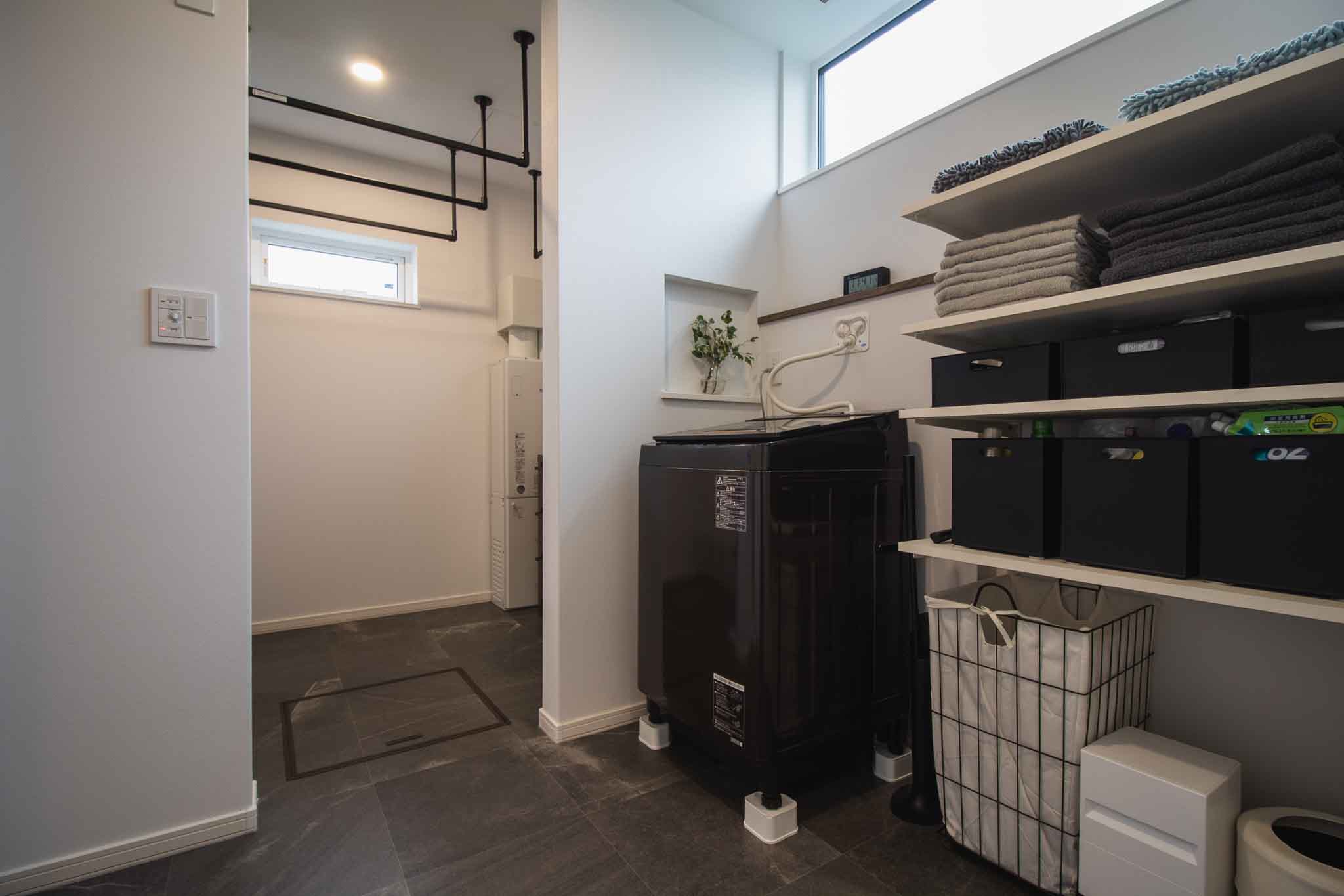ランドリールーム:ハンギングバーが4本設置され、たくさんの洗濯物を乾かすことができます。