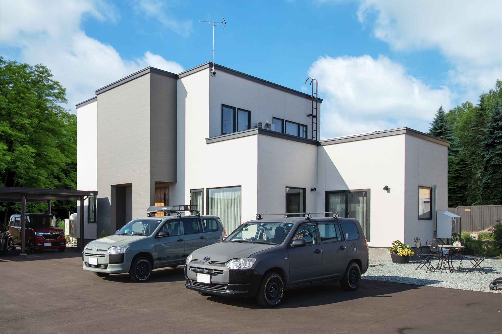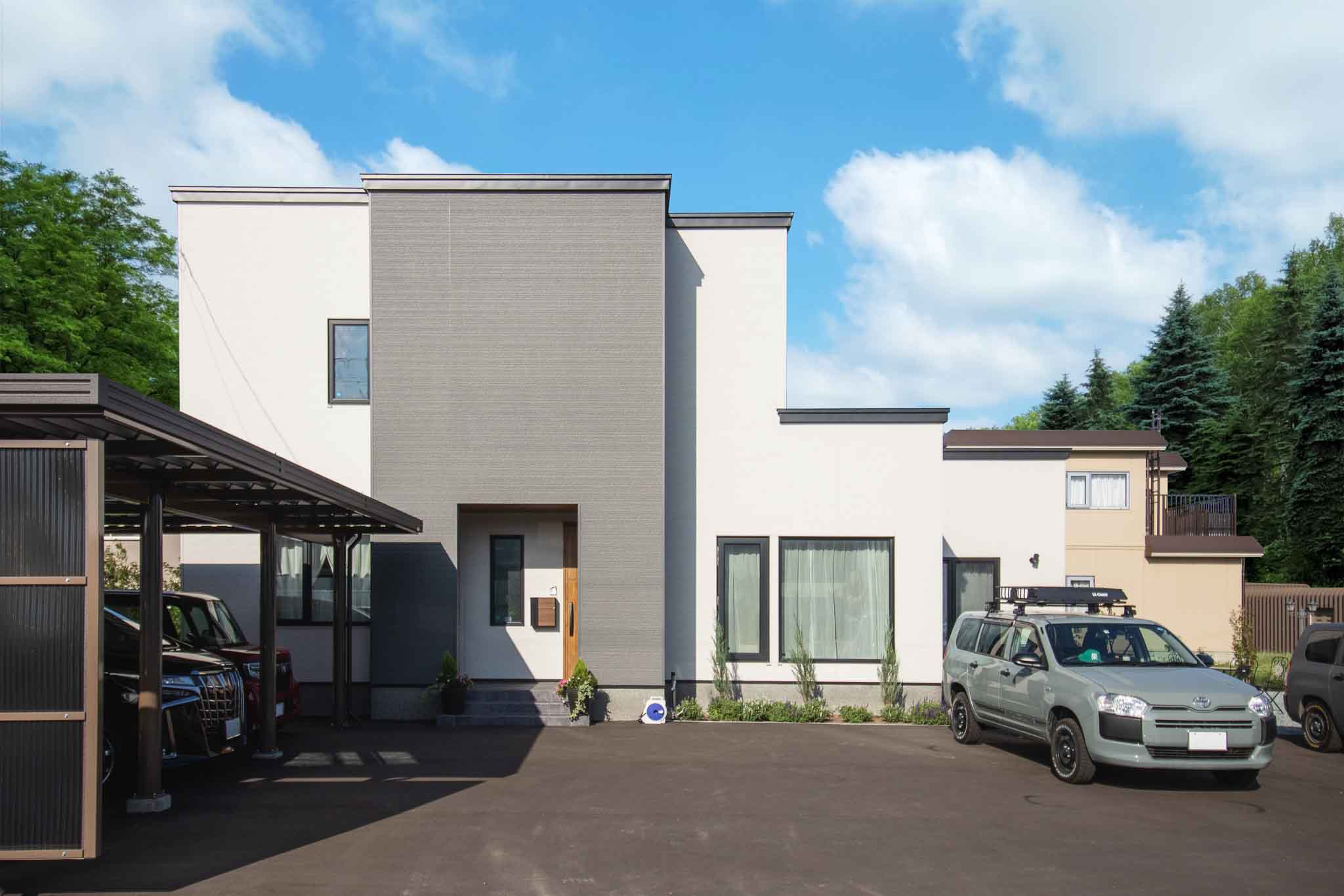 外観:広々としたお庭とオータムホワイトを基調とした外観。窯業系サイディングの組み合わせが洗練された印象を与えます。土台水切や窓サッシはブラックで統一し、全体のデザインを引き締めています。