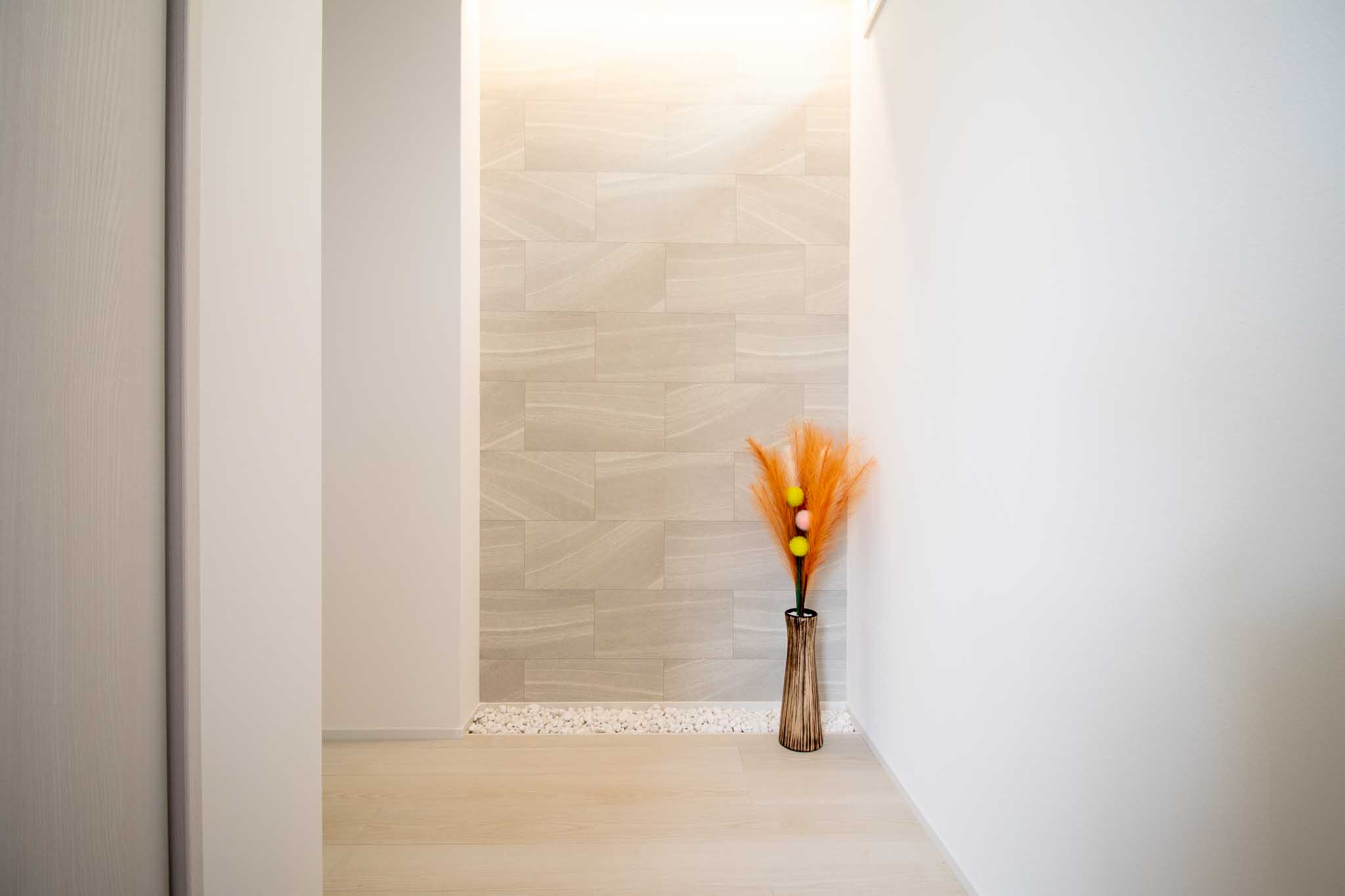 玄関:広々とした玄関は、シンプルで洗練されたデザインが特徴です。下足入れを設けず、すっきりとした印象を与えます。壁には間接照明が埋め込まれ、柔らかな光が玄関全体を照らします。訪れた人を温かく迎えるエントランスです。