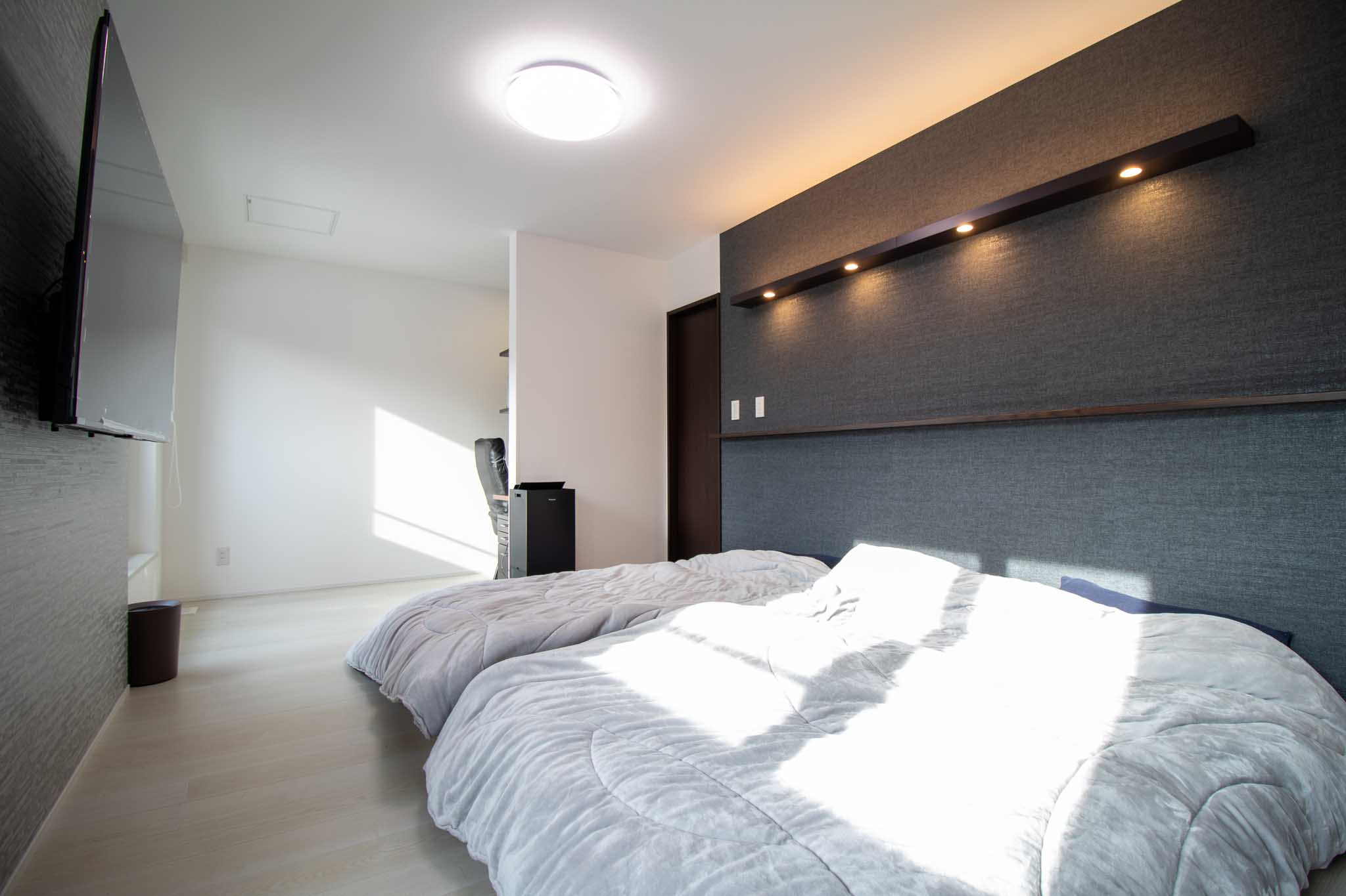 寝室:11.4帖の主寝室は、広くて落ち着いた空間です。グレーのアクセントクロスとブラケット照明が柔らかな光を演出し、リラックスできます。ワイドバルコニーに直接アクセスでき、お布団や衣類を干すのにも便利です。