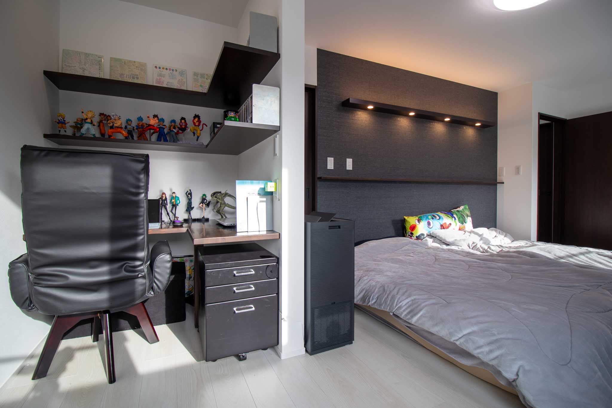 書斎スペース:主寝室内には造作のL字型デスクと棚が設置された書斎スペースがあります。パソコン作業や物書きに最適な広さで、集中できる環境が整っています。