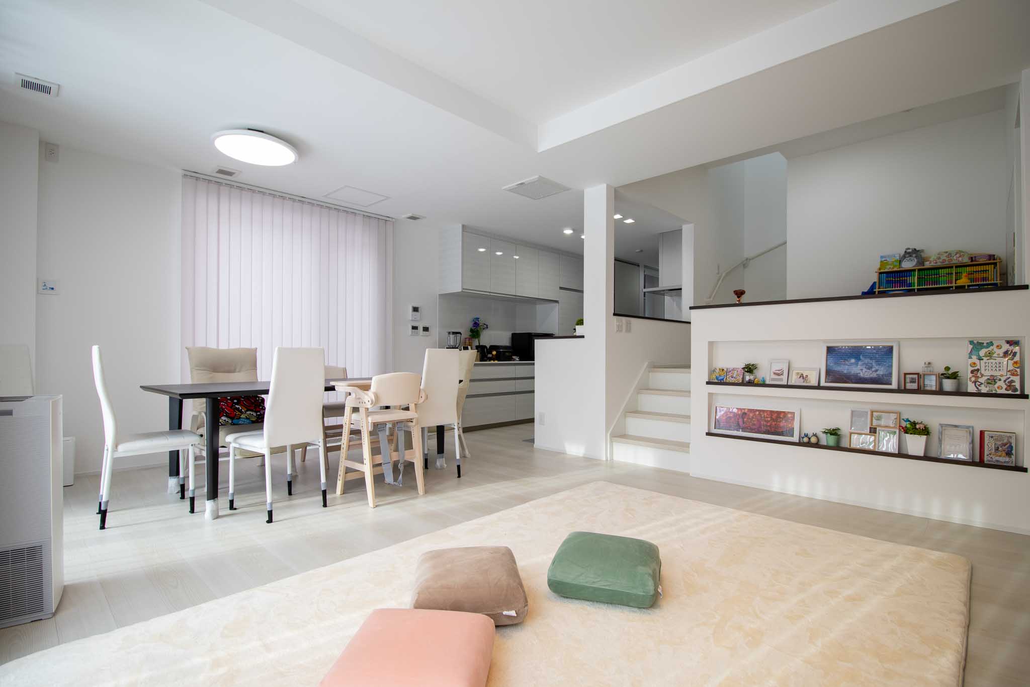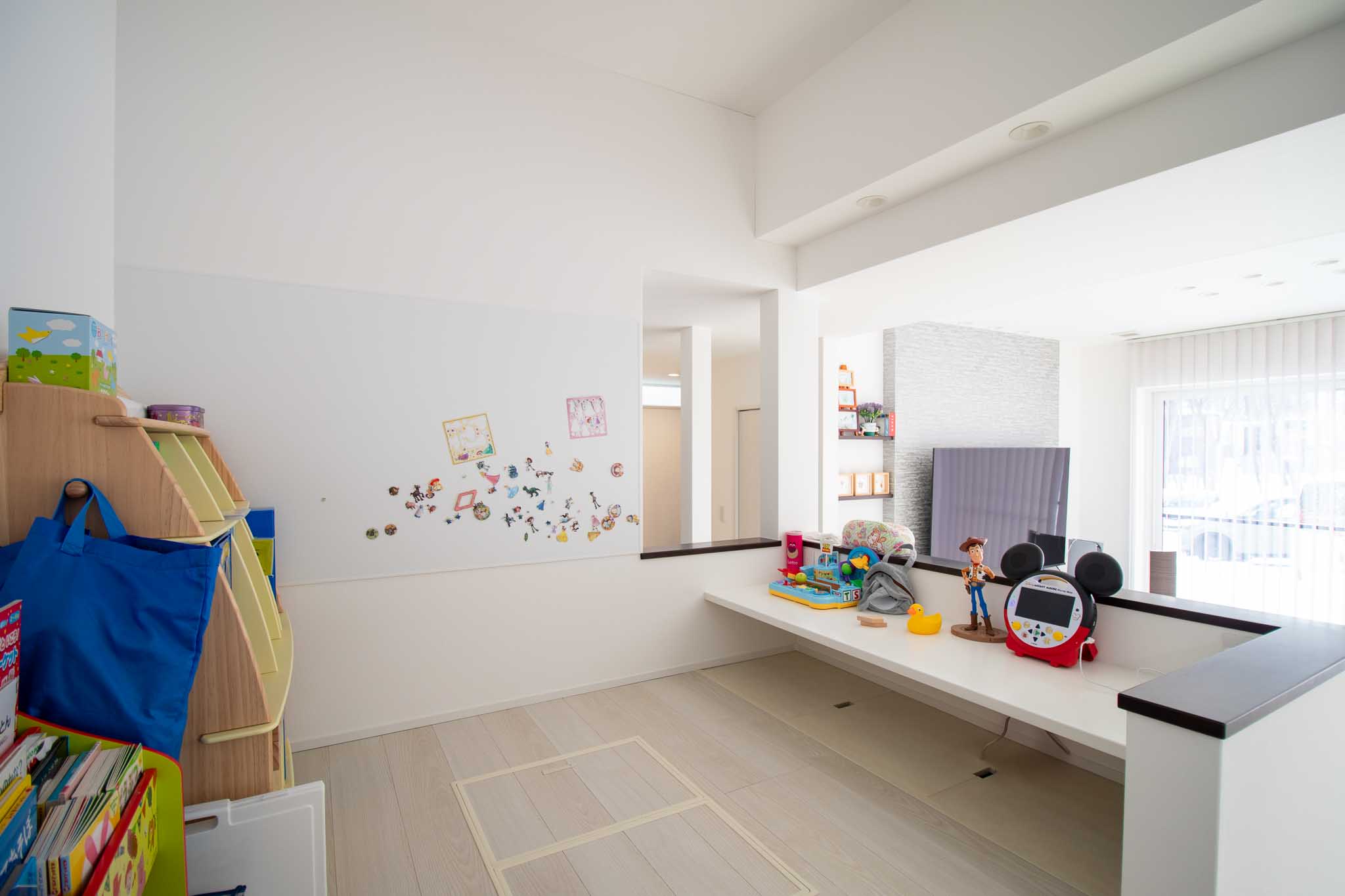 スタディスペース:階段ホールには掘りごたつのあるスタディスペースがあります。マグネットが付けられるホワイトボードクロスが設置され、リビング学習に最適な環境です。