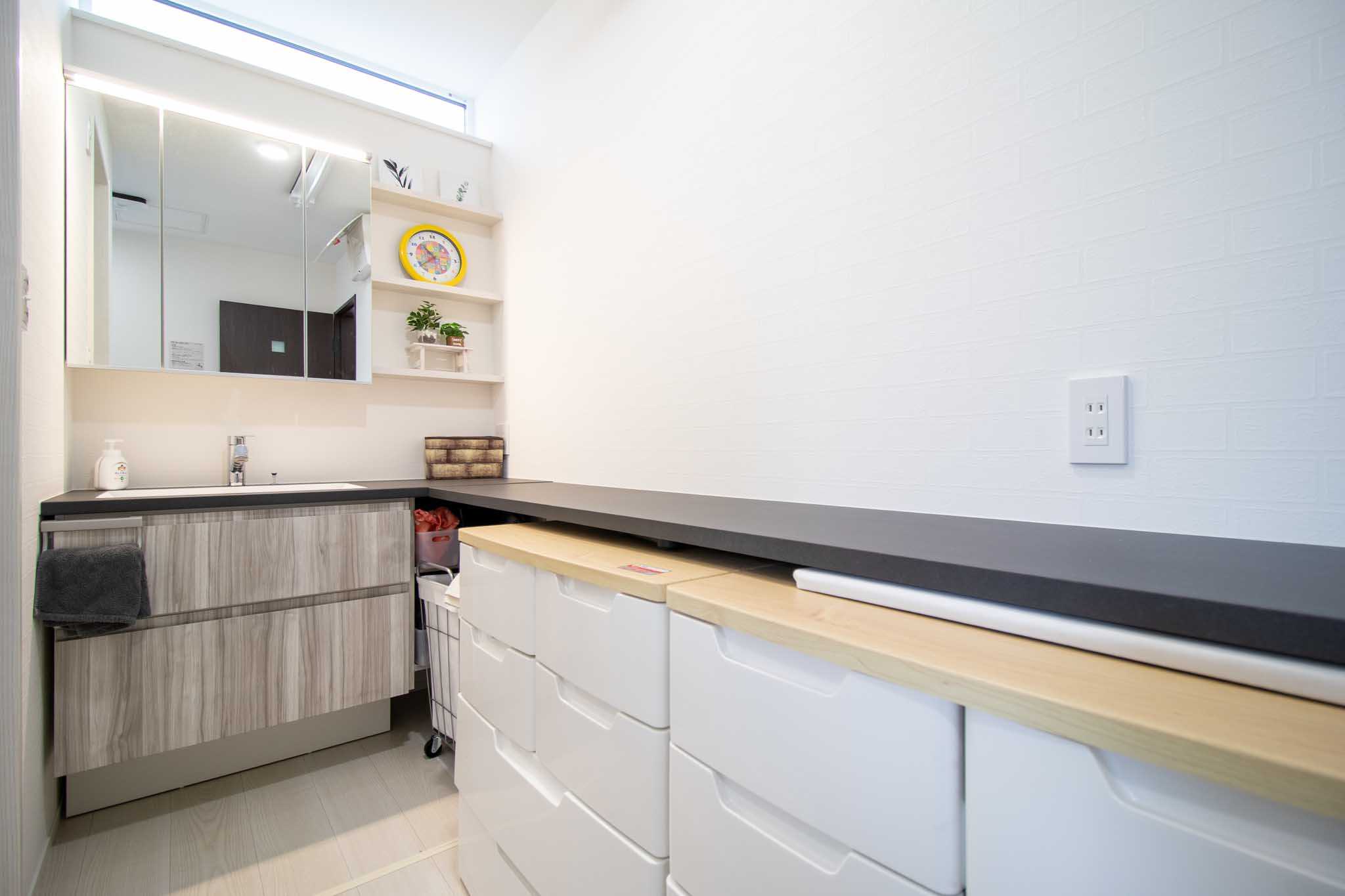 ユーティリティ:L字型の広々としたユーティリティスペース。洗濯機、シンクが並び、汚れ物の予洗いや洗濯物の乾燥、アイロン掛けなどが一連の流れで行えます。ハンガーパイプが設置されており、室内干しも可能です。