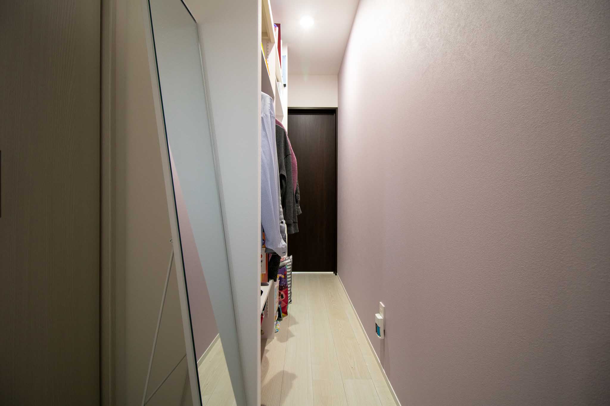 ファミリークローゼット:ユーティリティに隣接するファミリークローゼットは、奥行きがあり、可動棚やステンレスパイプが設置されています。洗濯物を畳んでそのまま収納できる便利な配置です。