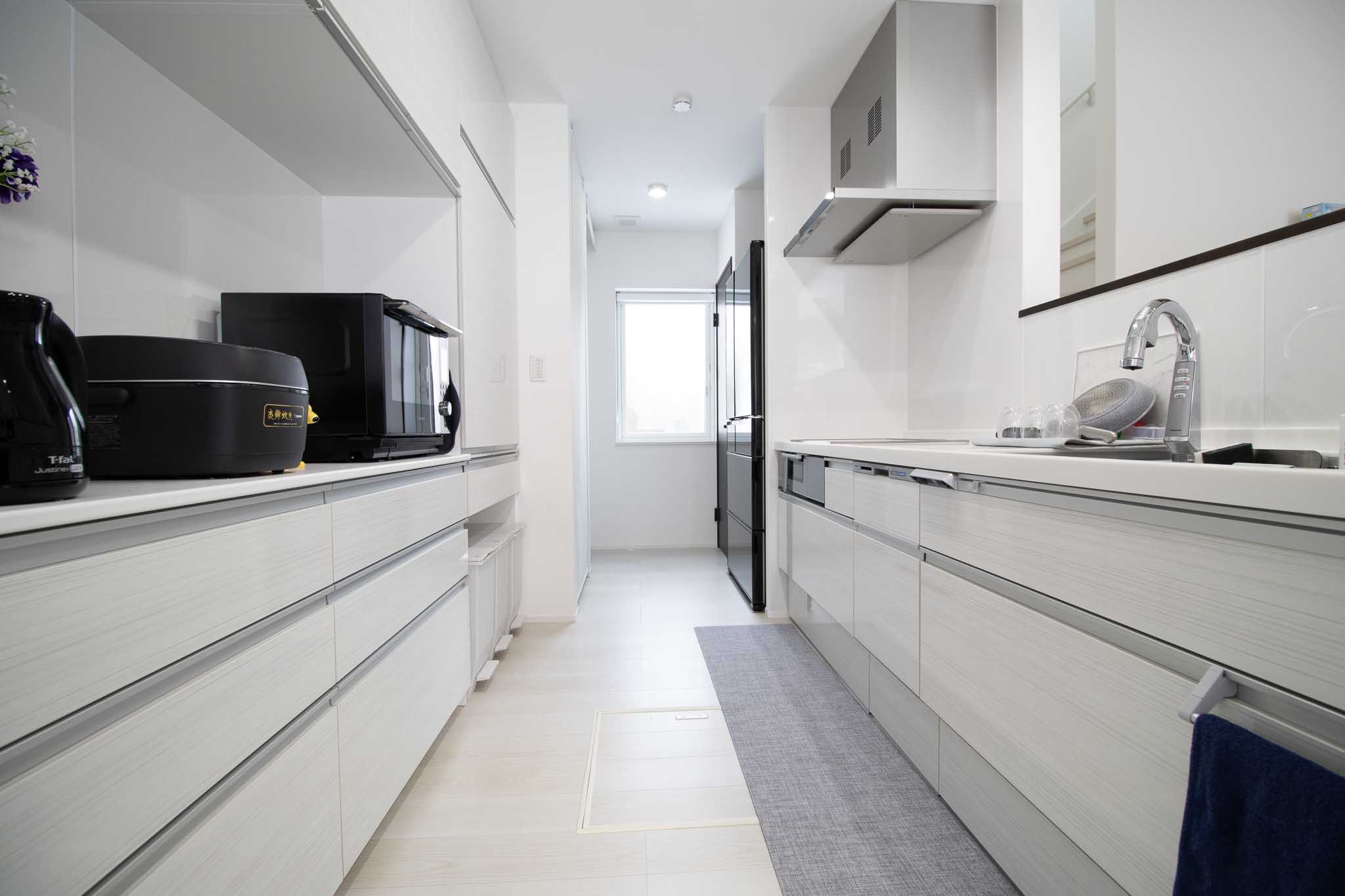 キッチン:パントリーを備えたキッチンは、冷蔵庫がパントリー内に隠されているため、生活感を抑えたスッキリとした空間です。幅2m55cmのキッチンはホワイトの人造大理石カウンターを採用し、収納力も抜群です。