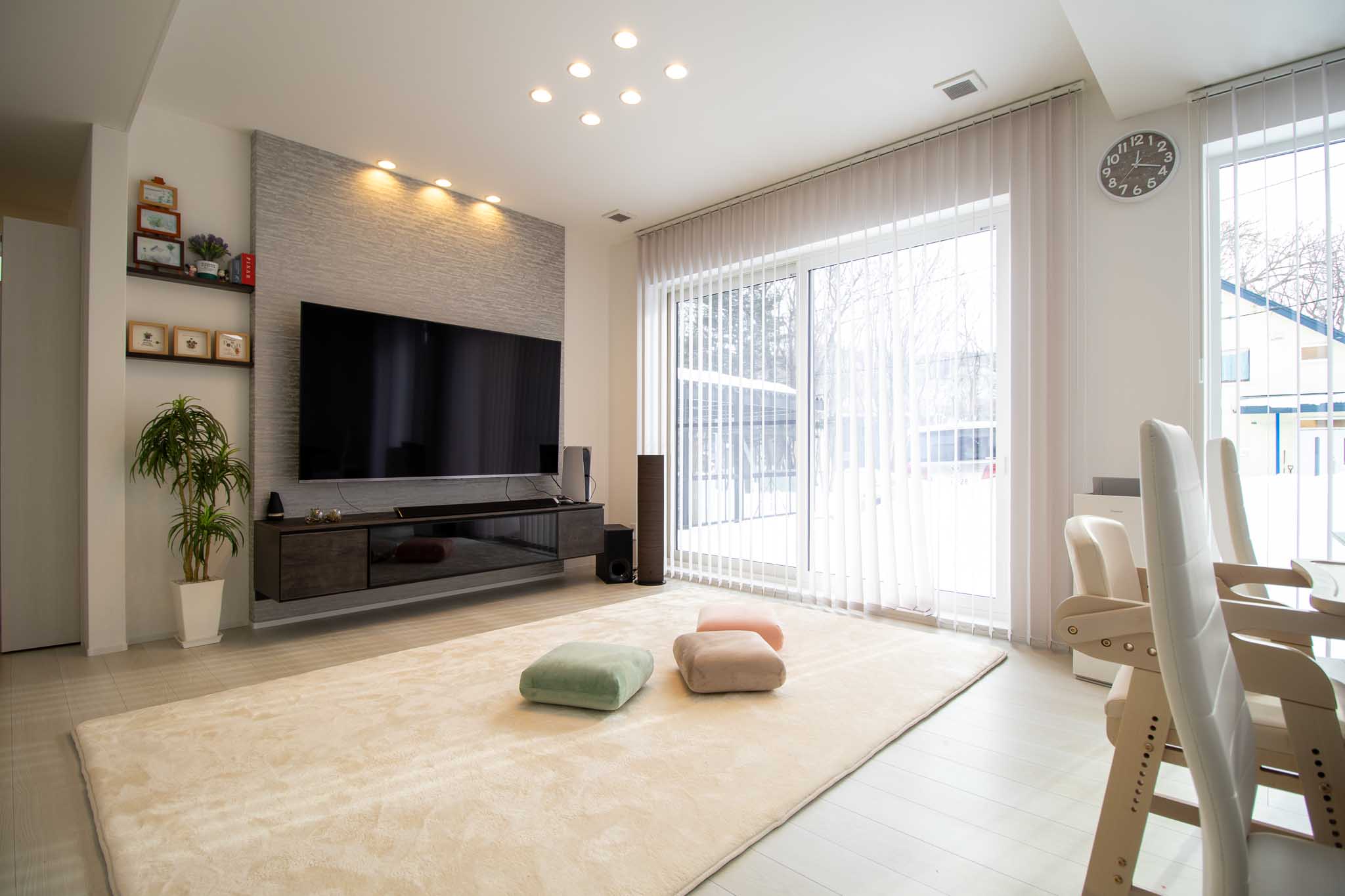 リビング:折り上げ天井が特徴の広々としたリビング。20.5帖のLDKは、南側の大きな窓から自然光がたっぷり入り、明るく開放的な空間です。TV背面にはグレーのタイル調クロスを採用。上部からの照明がやわらかく壁を照らし、空間にほどよいアクセントと落ち着きを与えます。フロートタイプのTV台は、床のお掃除もしやすく、すっきりとした印象を演出します。