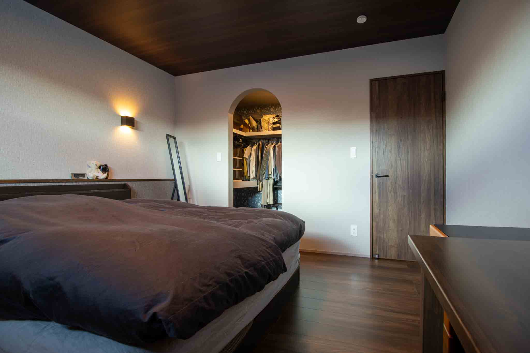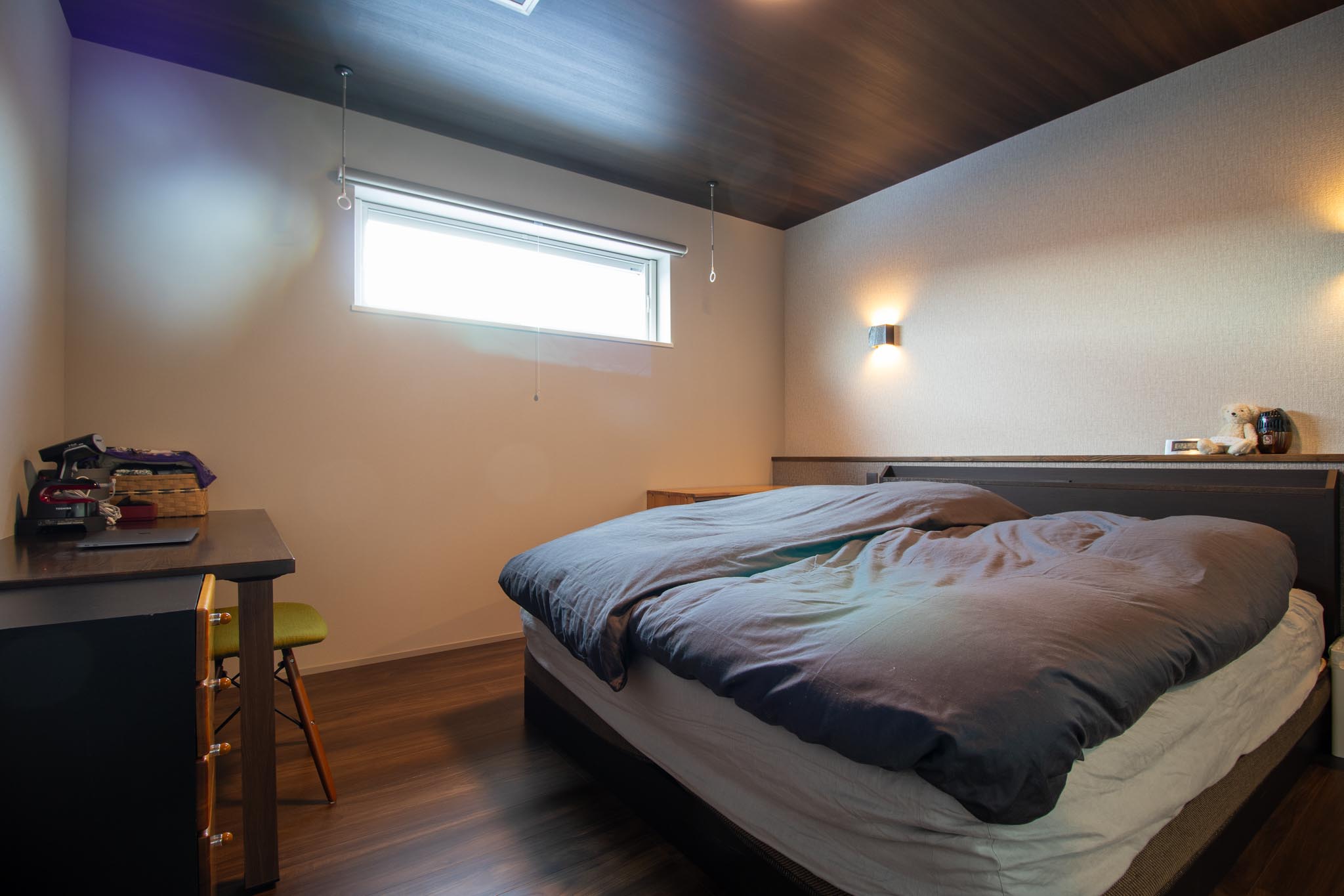 寝室:間接照明とバイカラーのアクセントクロスがホテルライクな雰囲気を作り出す主寝室。カウンター付きで、テレワークや書斎スペースとしても便利に使えます。