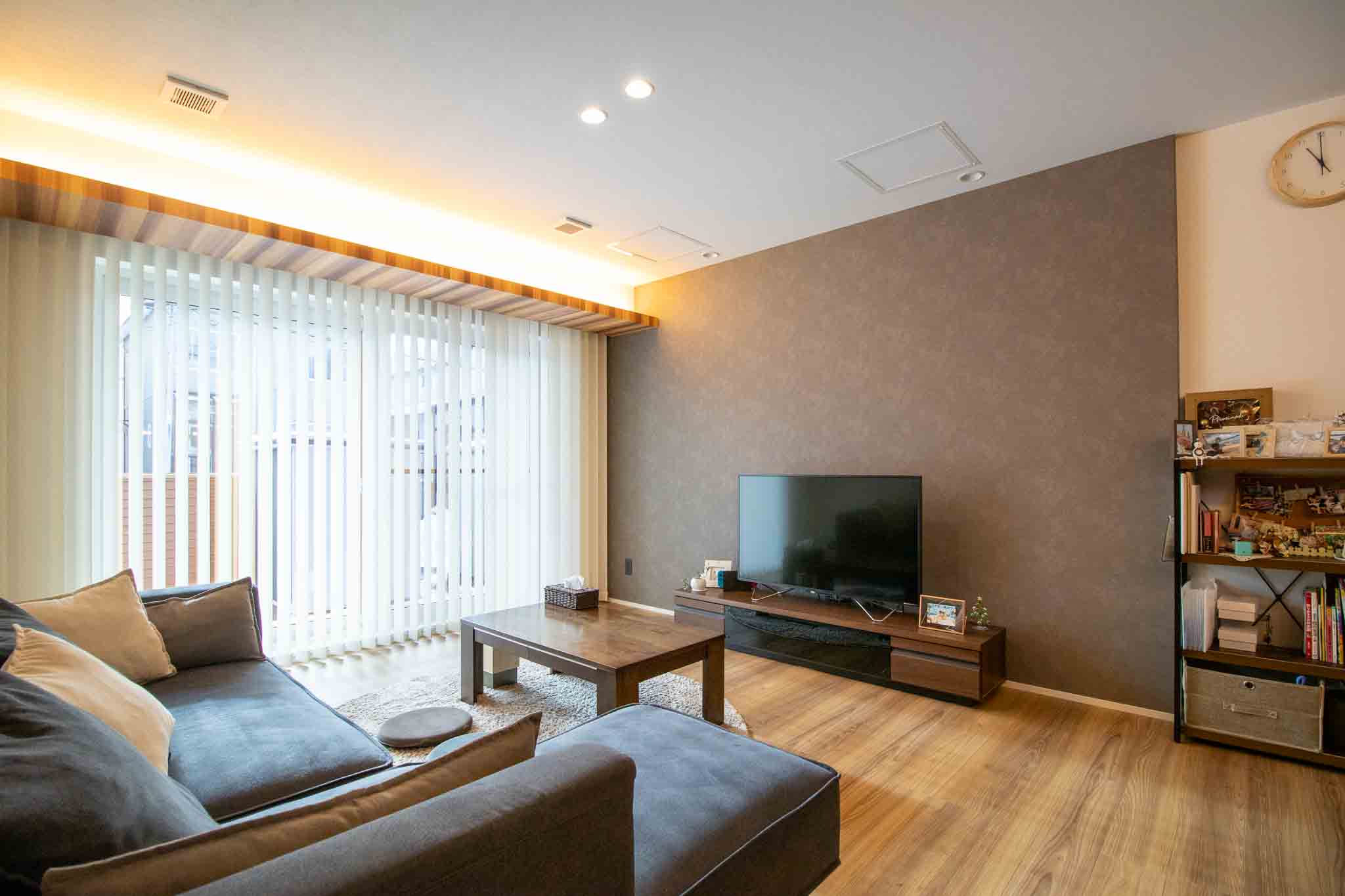 リビング:下り壁と間接照明が、夜も柔らかな光でリラックスできる落ち着いた空間を演出します。