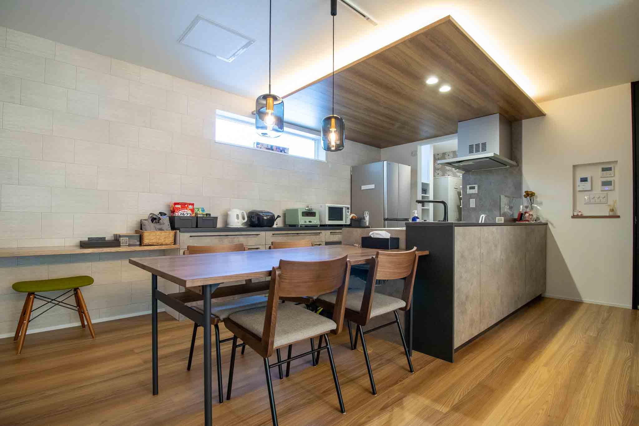 ダイニング:ダイニングには広々としたカウンターがあり、ワークスペースや学習スペースとしても利用できます。キッチンと横並びの配置で、家事効率が上がります。