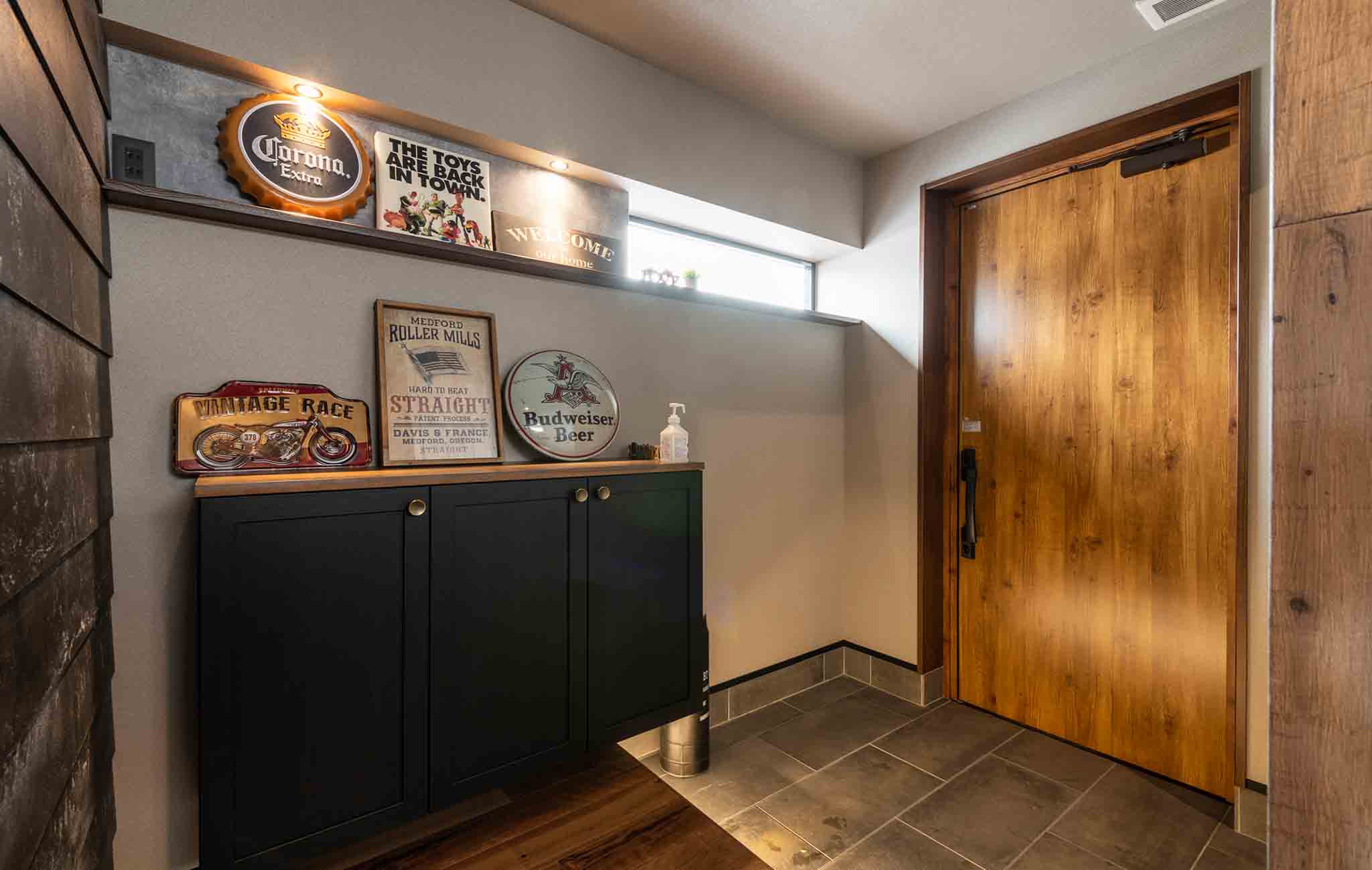 玄関:玄関は人目を引くデザインで、正面に見えるタイルは外装材としても使用されているセメントの無垢材を採用。3箇所のライティングが高級感を演出し、広さや奥行きを感じさせます。